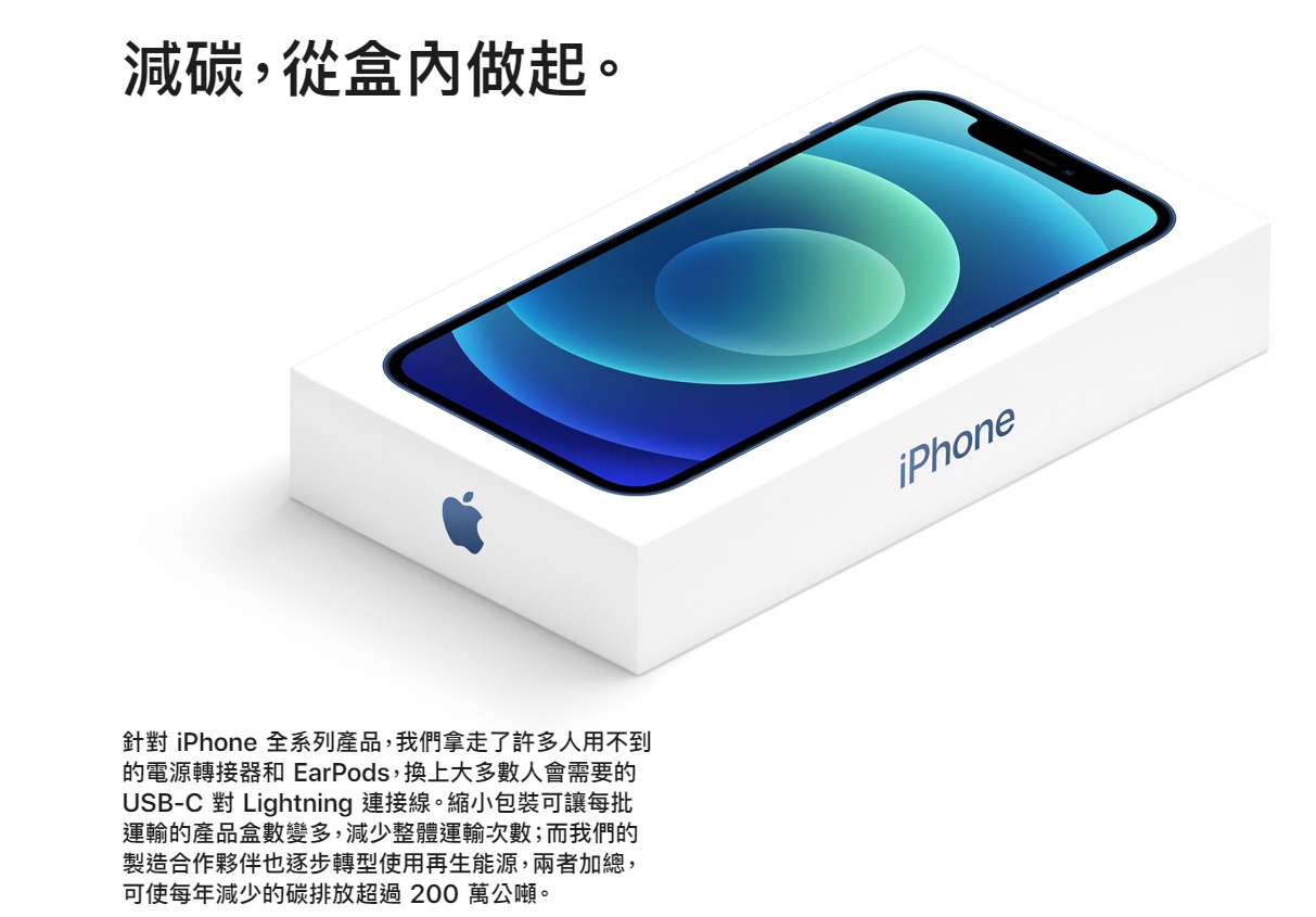 另外,APPLE也持續在環保方面做出貢獻,iPhone 12取消隨盒附贈的「豆腐頭充電器」和「EarBuds耳機」兩項配件來降低碳排放,但iPhone 12將標配USB-C to Lightning的充電線。