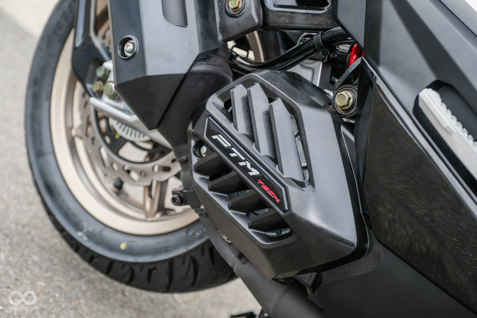 KYMCO KRV也使用了大膽外形設計,但同時兼顧台灣消費者注重的實用性。首先可以看到左右分離式的大燈運動感十足,銳利的線條彷彿隨時想劈開眼前的彎道,車身右側面下方,透過塑膠件點綴傳動系統CASE,營造出更戰鬥的氛圍;另一側則安裝水冷排。