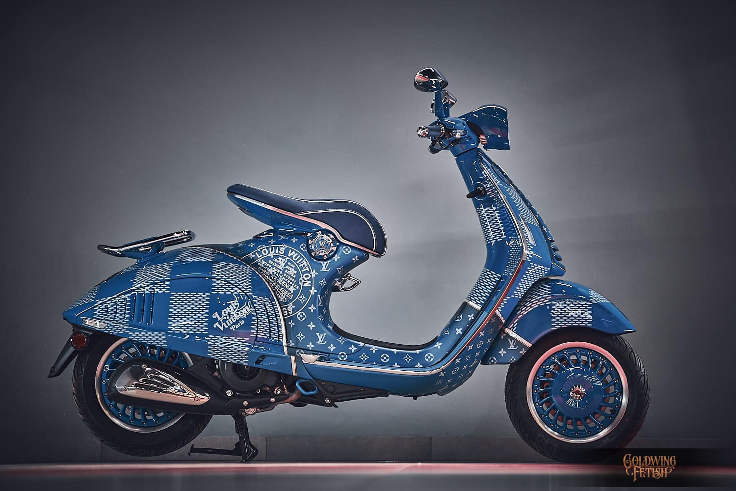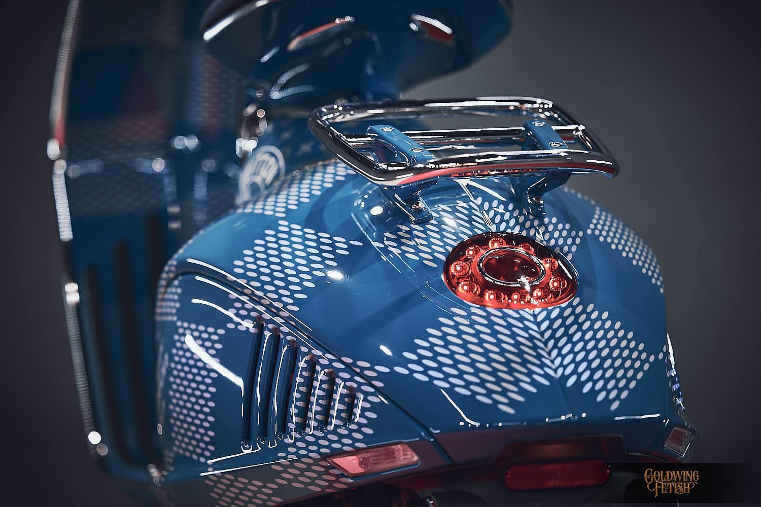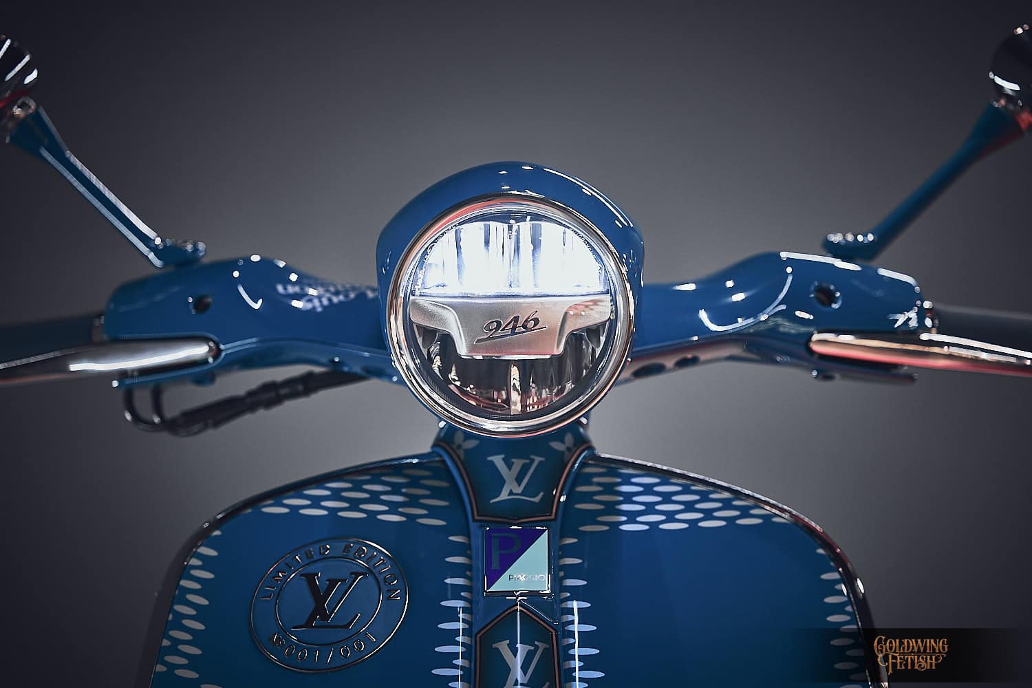 Goldwingfetish.ru過往擅長使用HONDA GOLDWING作為改裝基礎,本次他們則將目標設定在VESPA品牌中,近幾年極具代表性的946,延續原廠與精品聯名概念,全車使用藍色塗裝呈現,上頭的白色彩繪有著大量的LV LOGO,包含品牌的招牌花紋也都可以在Vespa 946 Louis Vuitton上看到。整台車散發滿滿的高雅貴氣,讓你想忽略這台車都有點困難!