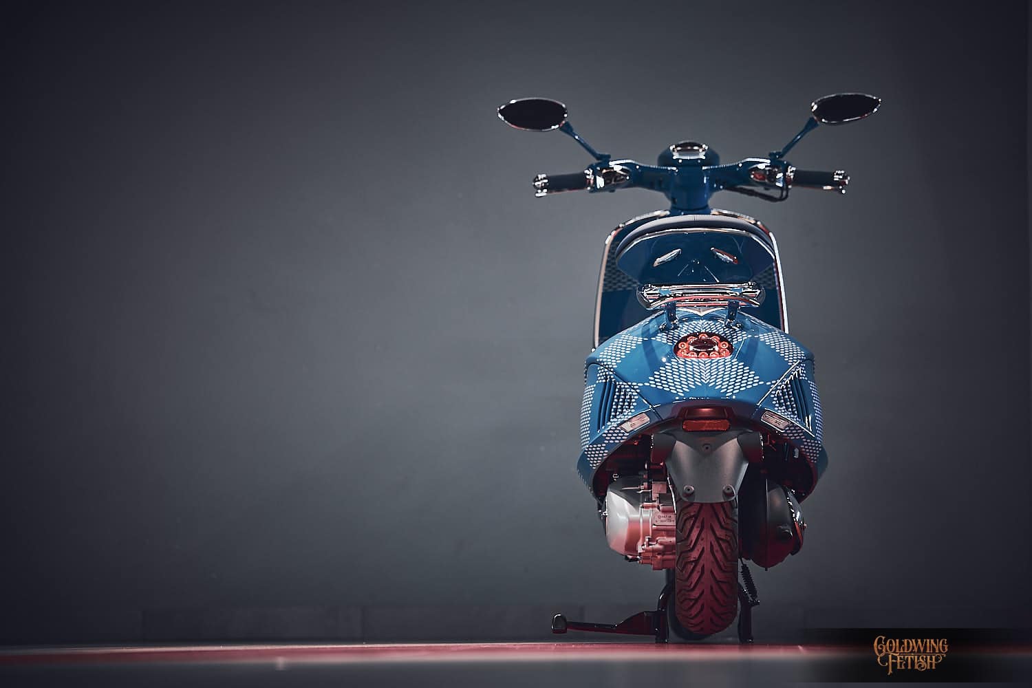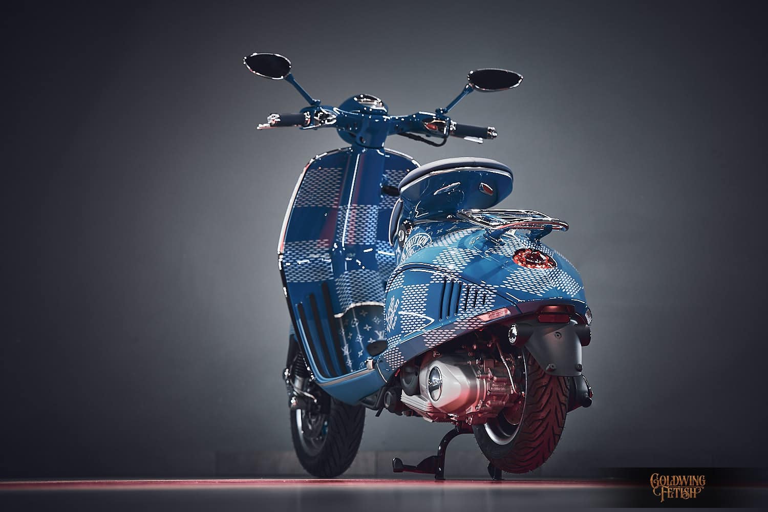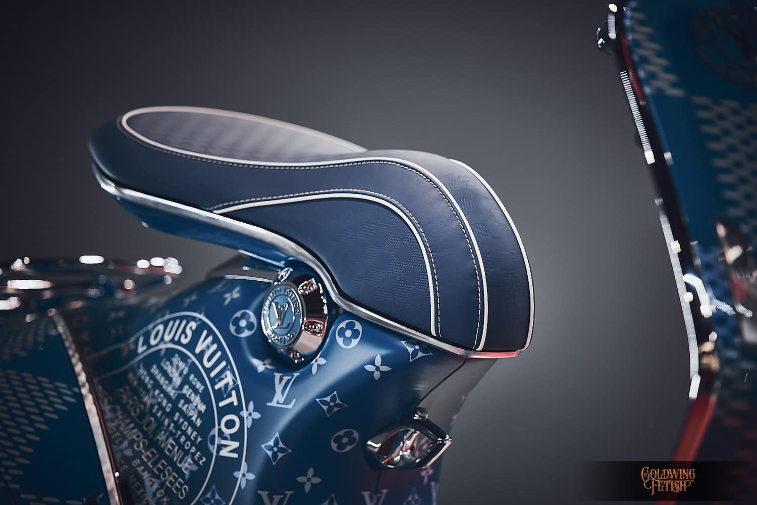 Goldwingfetish.ru過往擅長使用HONDA GOLDWING作為改裝基礎,本次他們則將目標設定在VESPA品牌中,近幾年極具代表性的946,延續原廠與精品聯名概念,全車使用藍色塗裝呈現,上頭的白色彩繪有著大量的LV LOGO,包含品牌的招牌花紋也都可以在Vespa 946 Louis Vuitton上看到。整台車散發滿滿的高雅貴氣,讓你想忽略這台車都有點困難!