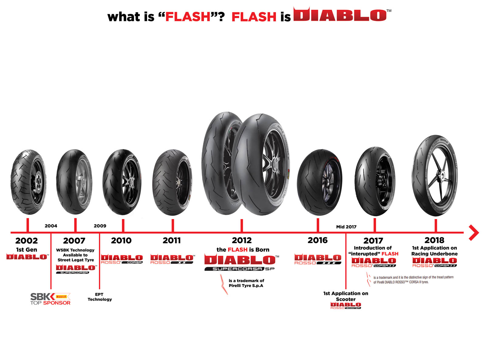 此項設計在2018年隨著DUCATI Panigale V4一同問世的第3代現行產品DIABLO™ SUPERCORSA(V3)上更加精進,具備了更窄的溝紋,以確保更高的循跡性以及對應側向推力的支撐性。儘管持續演進,DIABLO™ SUPERCORSA所呈現的閃電胎紋對於全球所有騎士而言,無論是在賽道競技或是公路馳騁,依然是倍耐力超高性能輪胎的完美典範。