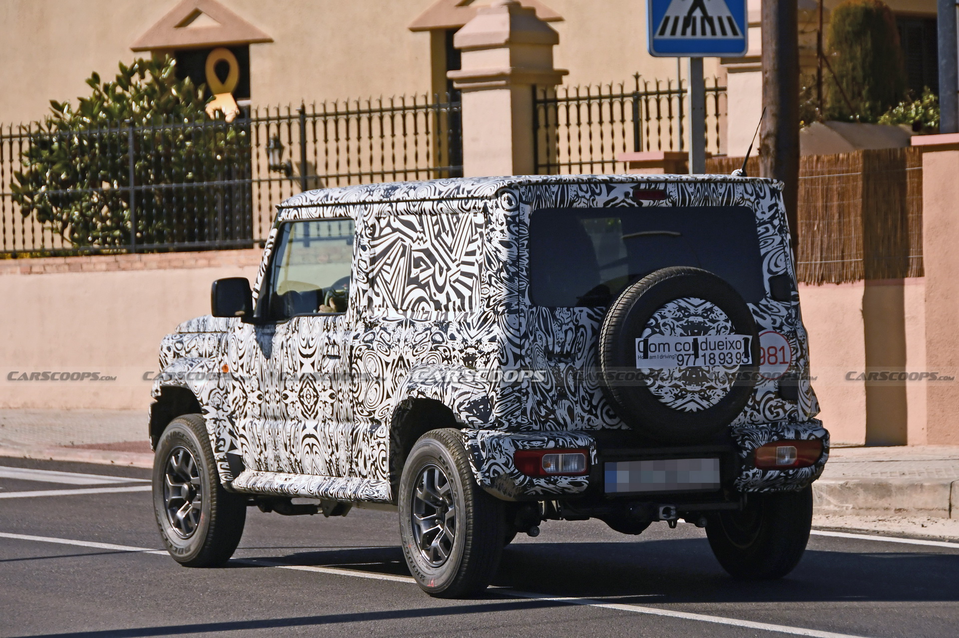 儘管外表包覆著層層偽裝,從方正外型、水箱護罩、燈具組及鋁圈等特徵仍可一眼辨識出這是Jimny,如同「書包」的外掛式備胎也沒有少。但從側面一看就能發現,這輛測試車的軸距可是比現行款還要拉長許多,且更有趣的地方在於,它還是維持「三門」設定,前門大小似乎沒有改變,倒是後半段的車窗及車室整個加長了!