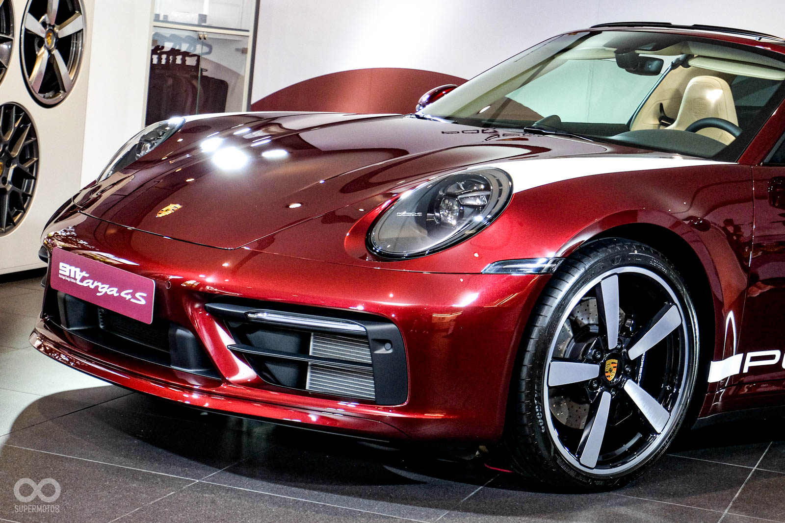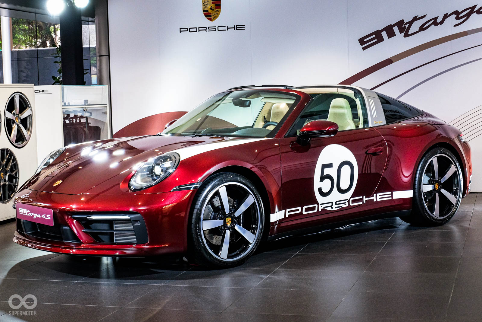 911 Targa 4S Heritage Design Edition車色提供專屬的金屬櫻桃紅(Cherry Metallic)與其他四款車色,金色盾徽展現強烈的1950年代復古風格,櫻桃紅的車身以復古白色塗裝與車側大大的經典50勾勒出獨一無二的身影。後引擎蓋格柵飾則以Porsche Heritage徽飾,造型設計類似當年Porsche 356達成 100,000km行駛紀錄所獲之獎章。