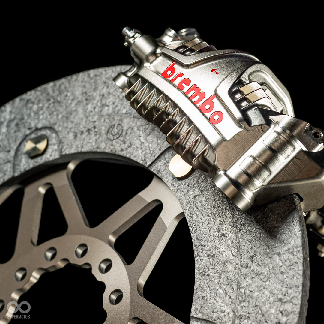 2020賽季,Brembo為我們帶來全新的GP4卡鉗,這款一體式鋁製卡鉗由實心鋁加工而成,最大的亮點在於外表導入類似空冷引擎的散熱鰭片設計,可以讓極端環境下工作的煞車卡鉗擁有更好的效率與性能。2021年版GP4卡鉗則透過內部的彈簧裝置,讓活塞未受壓力的情況下可以更正確回到待命位置上,避免增加阻力造成性能影響。