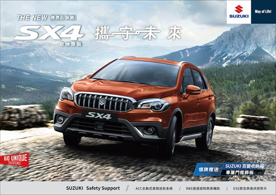 THE NEW SX4全新搭載ACC主動式車距巡航系統及RBS雷達感知煞車輔助,以嶄新的智能安全科技,結合優雅的歐式設計及SUV剽悍外型,搭載SUZUKI新世代動力BOOSTERJET 1.4 L渦輪增壓引擎的跨界休旅THE NEW SX4,標配支援Apple CarPlay® 及 Android Auto™的多功能觸控式螢幕帶給台灣消費者更安心的駕馭心樂趣。