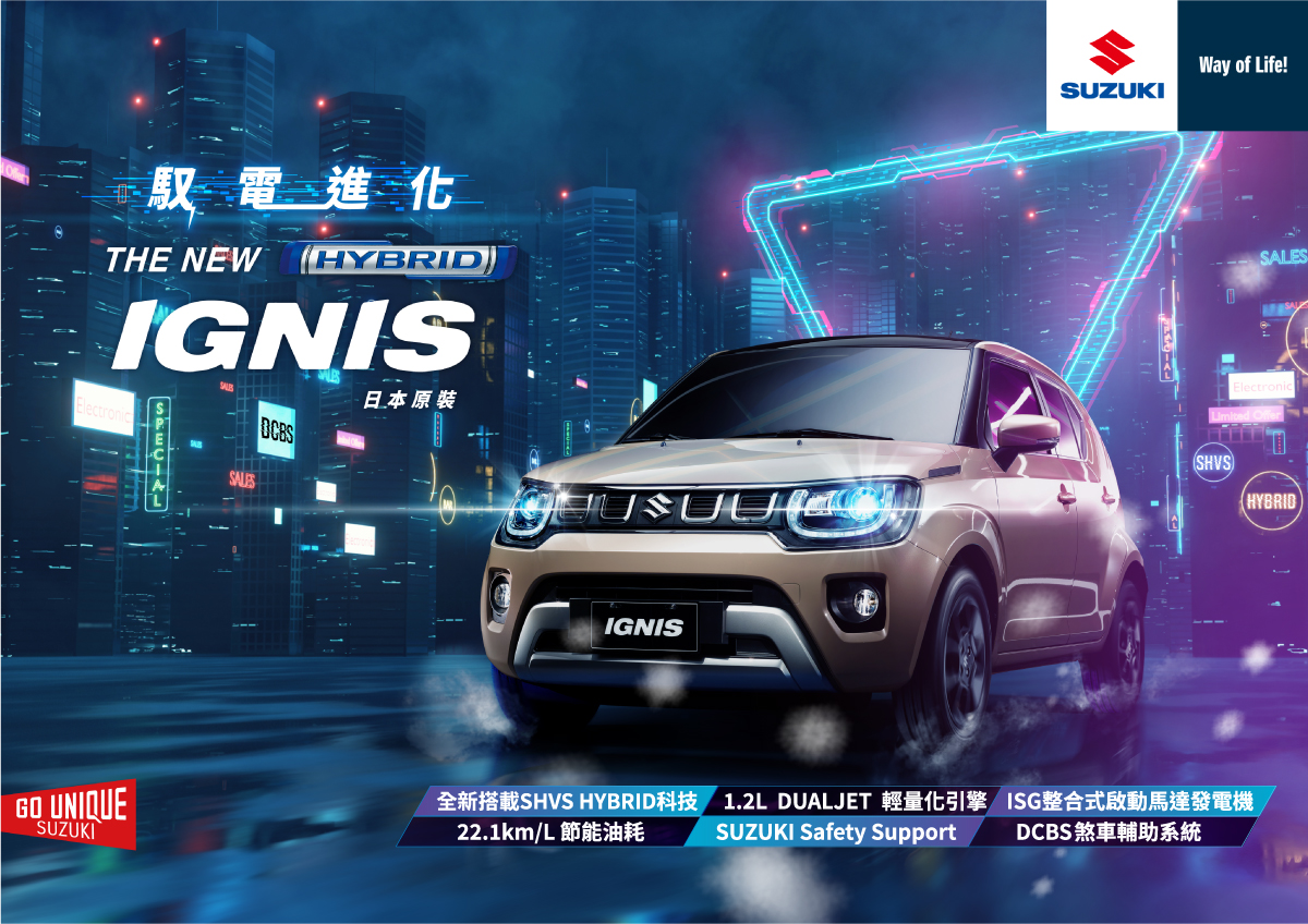 SUZUKI新世代戰略小車IGNIS,結合掀背車功能與SUV車型的高頂設計,搭配靈活多變的座艙配置,以SUZUKI首部SHVS(Smart Hybrid Vehicle by SUZUKI)智能混合動力車之姿,再次撼動台灣車壇!1.2L DUALJET輕量化引擎,以1,197cc最小級距排氣量,造就THE NEW IGNIS兼具稅金與燃油的雙效節能表現,創造全面進化的駕馭體驗。