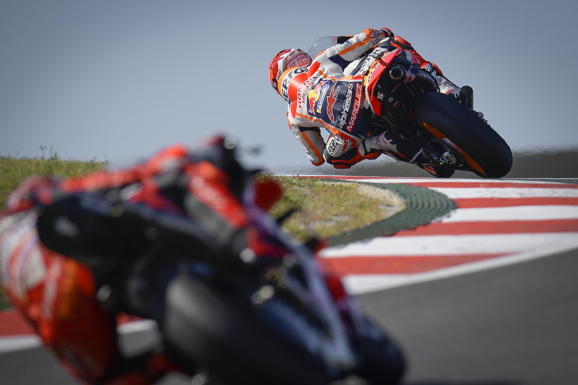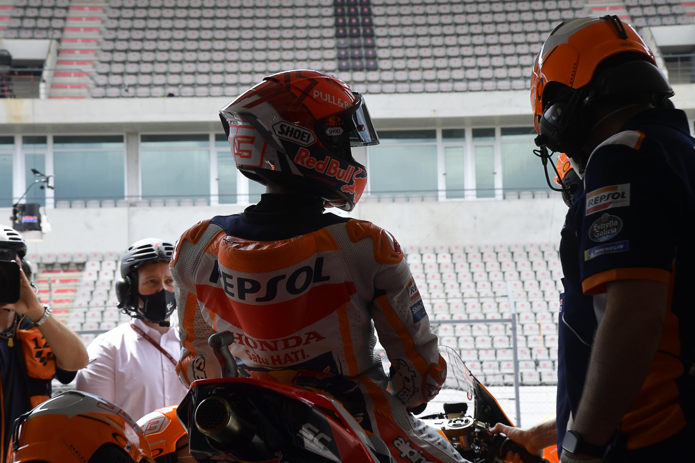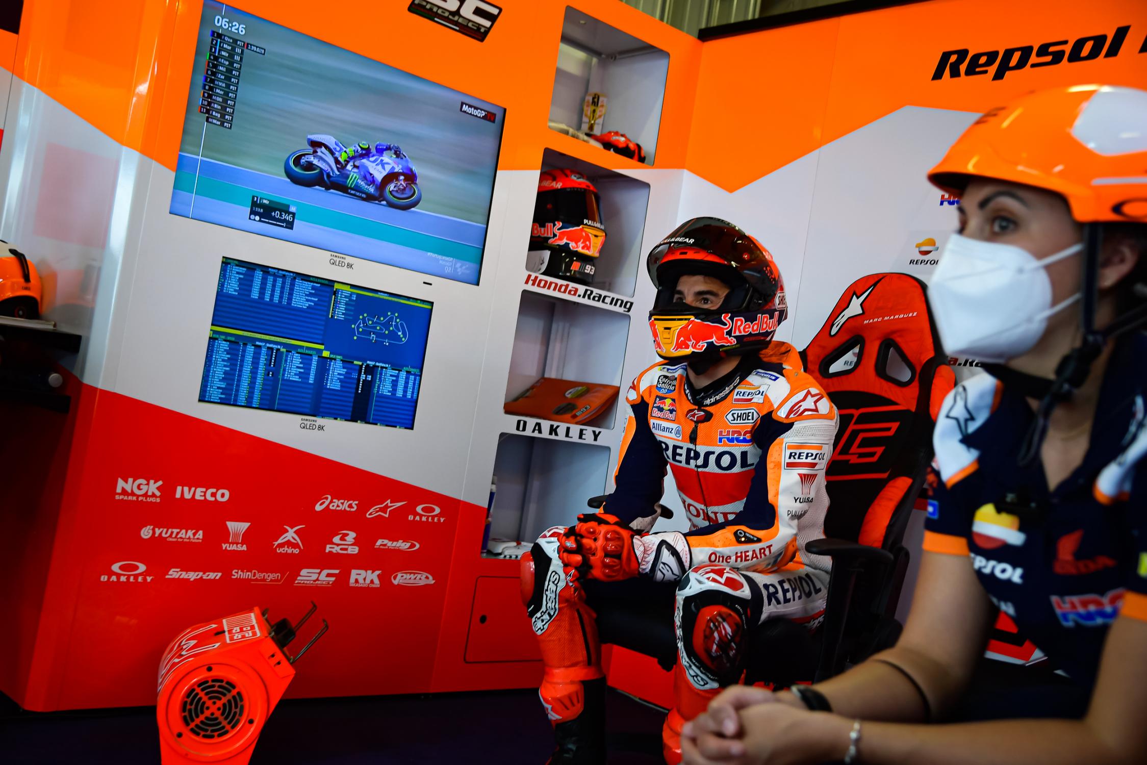 「最困難的是第一圈,因為我感覺自己不在應該要待在的位置上,就像新生在學校裡跟一群大學長踢足球一樣的違和。」Marquez笑說,「在第一圈我沒有節奏,也沒有找到好的感覺,然後Joan Mir與其他人開始超越我,在一段時間之後,我依然沒辦法理解並找到一個好的剎車點,一旦入彎之後我沒辦法做出好的彎中路線。」