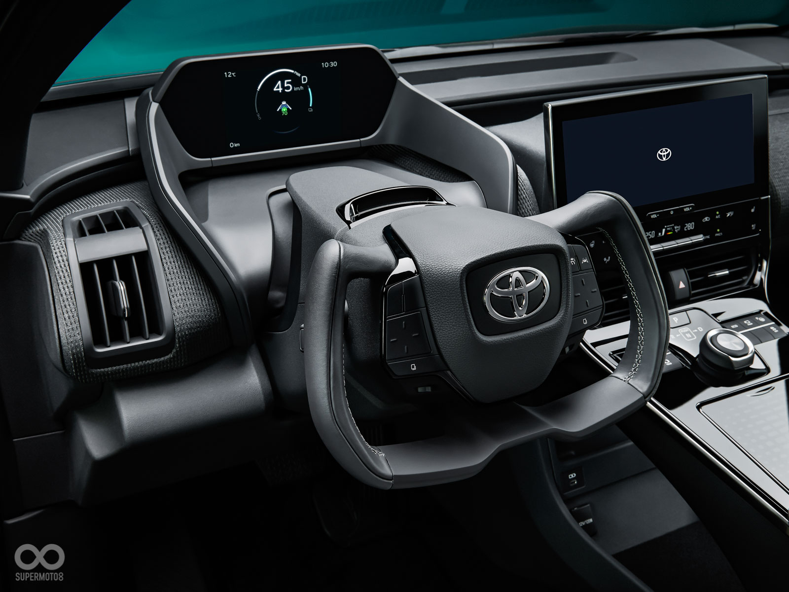 對比外觀帶來的衝擊,bZ4X的內裝更是令人驚訝連連,首先Toyota大膽在內裝使用只有3/4盤面的方向盤;儀表也明顯移動至靠近擋風玻璃位置;中央多媒體螢幕尺寸看起來大上不少,搭配旋鈕式的線傳排擋頭整體車艙呈現出新世代的科技氛圍;因應其尺碼定位(看起來與RAV4差不多大小),後座依舊保有不錯的舒適性。
