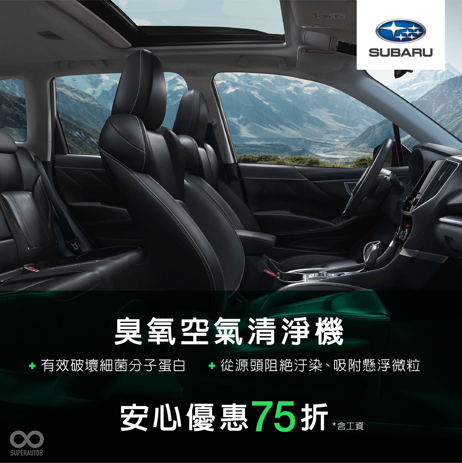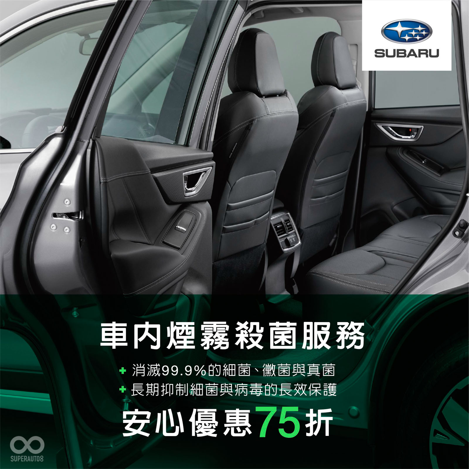 SUBARU所推出的臭氧空氣清淨機,可從空調源頭阻絕汙染及破壞細菌分子蛋白,不僅可維持車內清新的空氣循環,進而避免細菌滋生、去除車內異味;而車內煙霧殺菌服務,可消滅99.9%的細菌、黴菌與真菌,提供抑制細菌與病毒的長效保護。而為回饋所有車主,自即日起至全台各地二級防疫解除期間,SUBARU將持續提供75折的安心優惠價,與所有車主共同防疫。