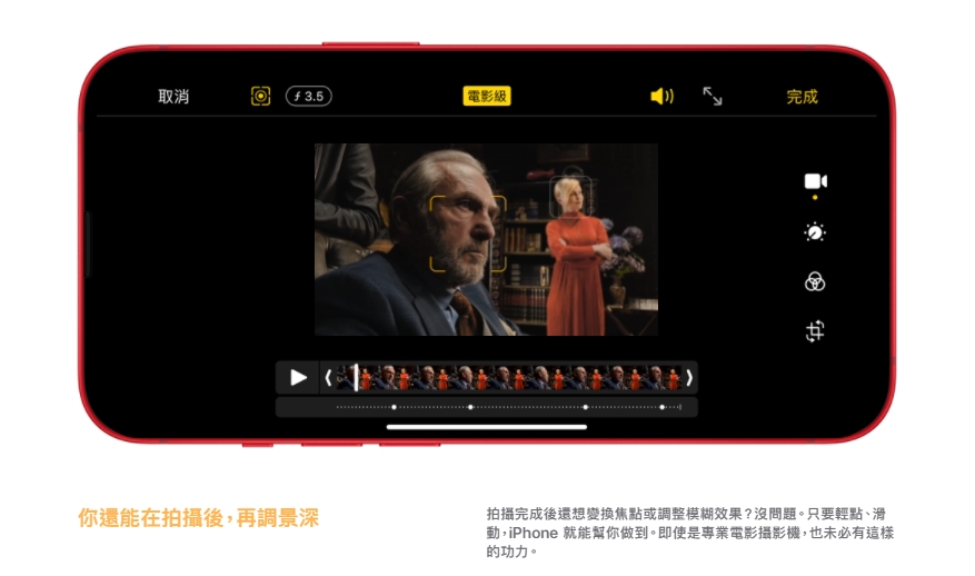 拍攝鏡頭方面,iPhone 13系列加入全新的Cinematic mode電影模式,能自動辨識、切換對焦、改變景深,拍攝時還能調色,創造出更有電影感的畫面。