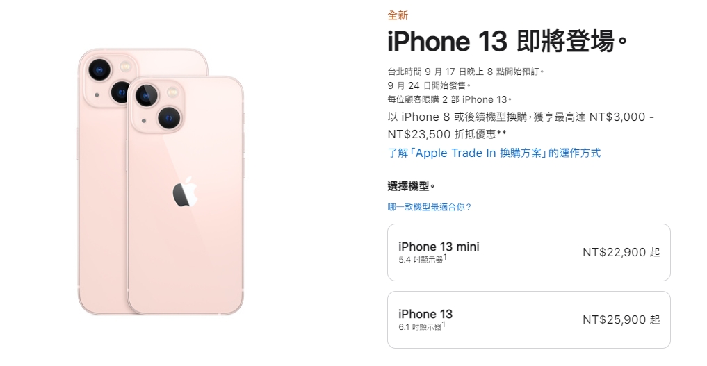APPLE台灣官網上也公布iPhone 13系列的預購日期將從9月17日晚上8點開跑,並且將會在9月24日開始發售,想換新手機的朋友可以前往APPLE實體門市或網路查看囉!