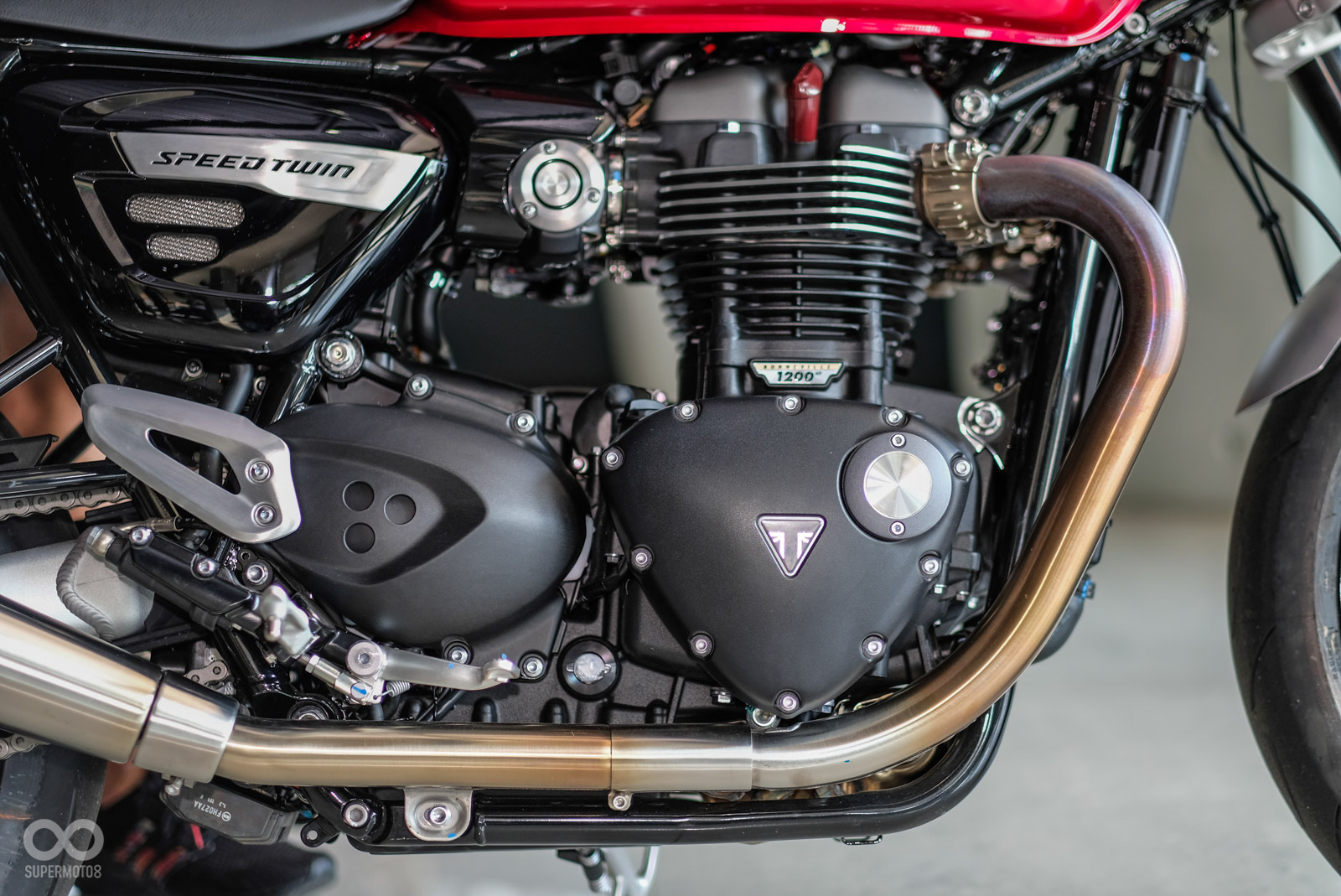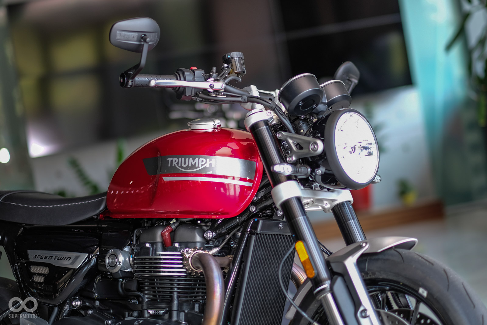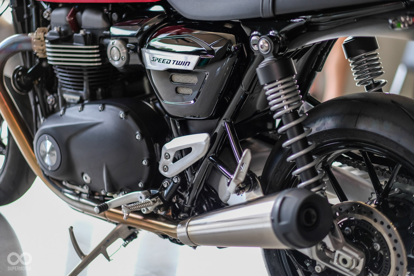 SPEED TWIN在本次改款中外型大致維持和前代相同的樣貌,依舊有著大家熟悉的經典街車外型,圓燈、街車把、水滴狀油箱、平坦的坐墊、左右雙出排氣管等有點像是野狼的風格感;車身上,TRIUMPH將SPEED TWIN的排氣管從前代的黑色管身改為全金屬原色呈現,看來更有英倫風格的古典氣息。