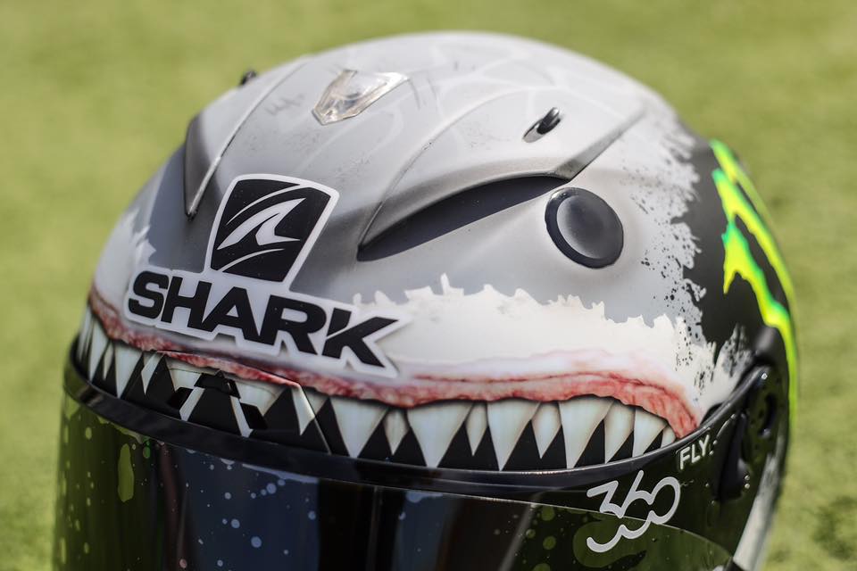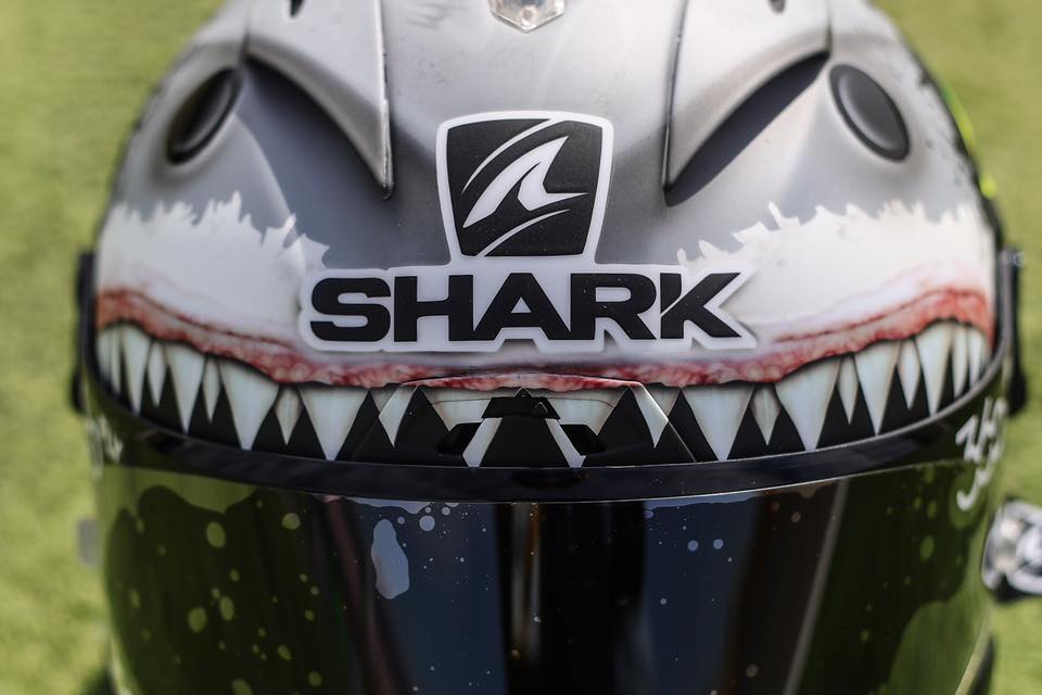 結束了與Rossi唇槍舌戰打的火熱的聖馬利諾站,本週回到Lorenzo主場,西班牙 亞拉岡。依照慣例,安全帽廠會針對車手心境設計具有紀念價值的主場彩繪帽,本站,這頂相當吸睛;凶惡十足的鯊魚彩繪帽正式誕生!而這背後也似乎有著深遠意涵。