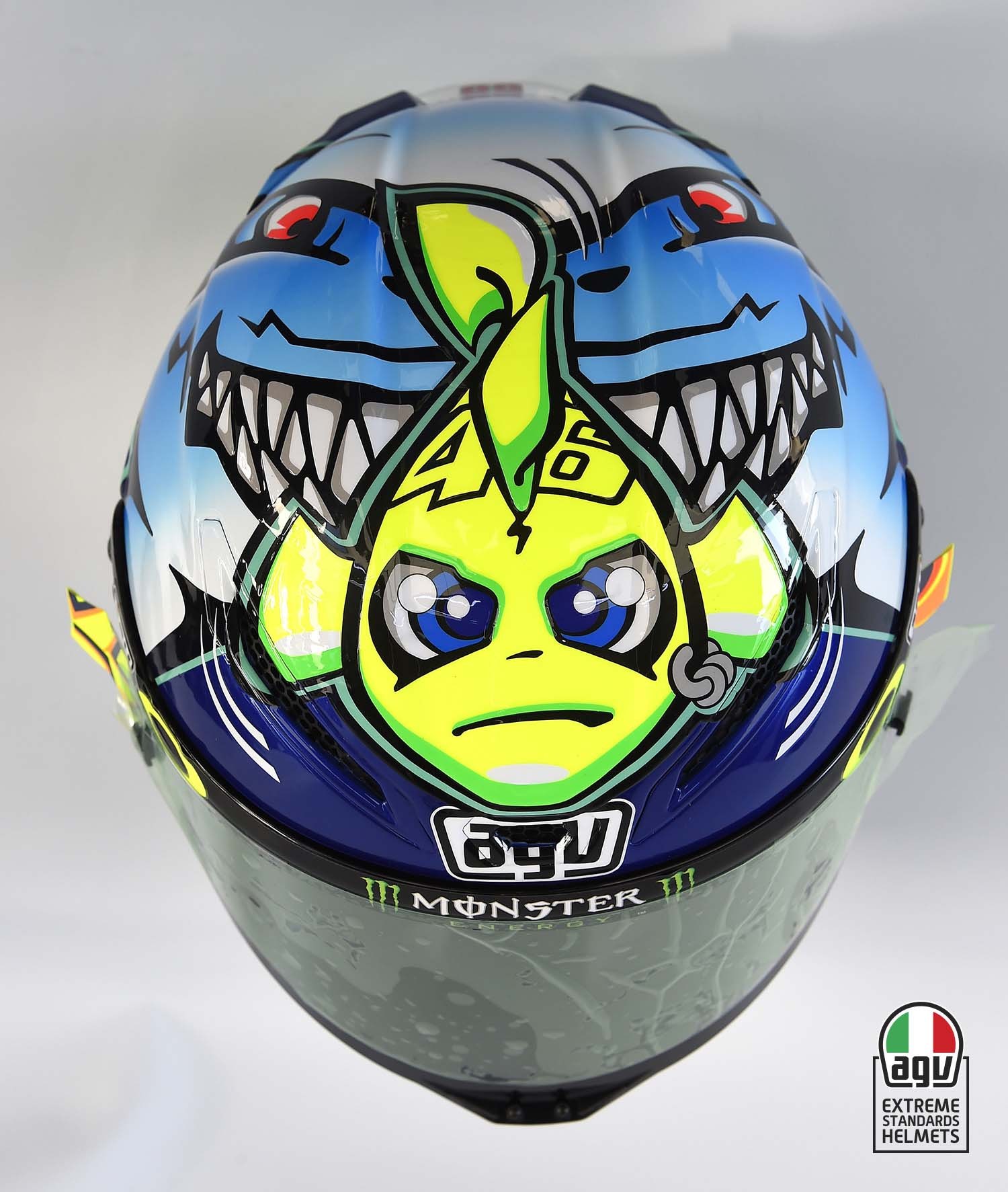 如果Rossi走的是搞怪卡通風,那Lorenzo就屬現實派了,還記得過去在他身上出現過最知名的太空人帽,真實考究的塗裝確實吸引很多騎士收藏此帽款。而這次的大白鯊也走著相同路線,不倫在描繪鯊魚那灰色的外皮與那尖銳的牙,都十足讓人感到真實,再加上那進氣孔位與鯊魚眼睛,將這次主題詮釋的非常到位。