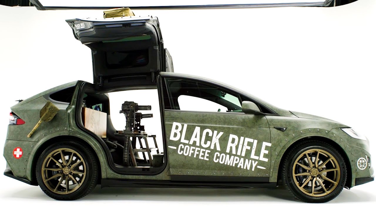 在路上開車難免會遇到道路糾紛,而有不少人為了怕遇到糾紛會吃虧,因此會在車上擺放球棒或者是高爾夫球桿防身,但現在如果你只有球棒的話可能就落伍了,美國有一間由退伍軍人所創立的咖啡品牌Black Rifle Coffee,在他們經營的YouTube頻道上展演了他們最新的Model X改裝,令人驚嘆的是他們直接在後座放上了兩挺M134迷你砲機槍,而且還可以真的發射出子彈,恐怕是史上最兇悍的Model X,就算你身穿防彈背心可能都擋不住這輛車的攻擊。