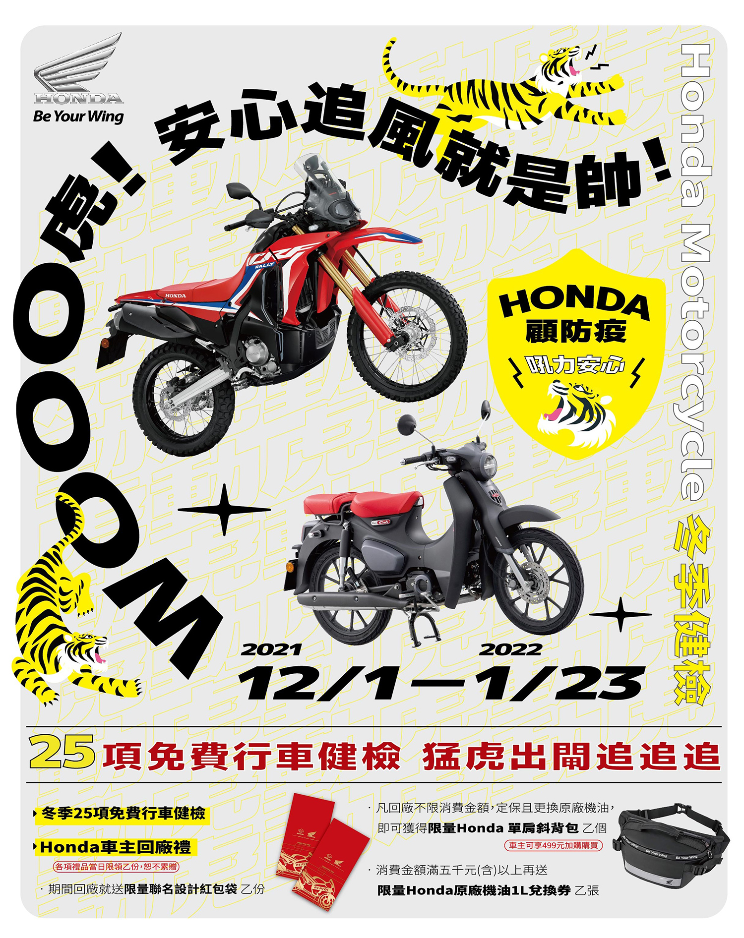 為讓親愛的車主有著更全面的服務,Honda Taiwan將於2021/12/1到2022/1/23於各區Honda Motorcycle經銷據點舉辦 「Wooo虎!安心追風就是帥!」免費健檢活動,將提供免費25項行車安全檢查以及回廠好禮、消費滿額禮、定保換油禮等,另外還有Repsol機油、Pirelli、Michelin輪胎販促優惠活動等。敬邀親愛的車主安心回到Honda Motorcycle保養愛車,共創充滿安心且喜悅的重機生活,一同帥氣追風迎虎年。