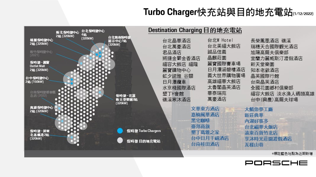 截至今日,保時捷在台共設置 9 處保時捷高速充電站 (Turbo Charging),包含19支充電樁,以及48處目的地的充電站 (Destination Charging),涵蓋全台豪華度假飯店、高爾夫球場及賽車場等地,合計共100支充電樁,服務網路遍及全台各地。