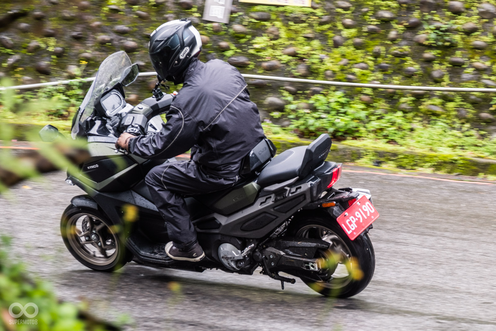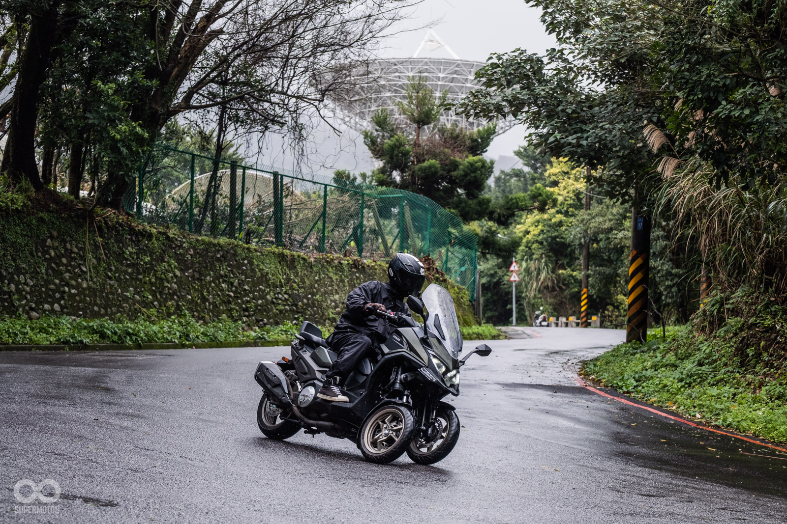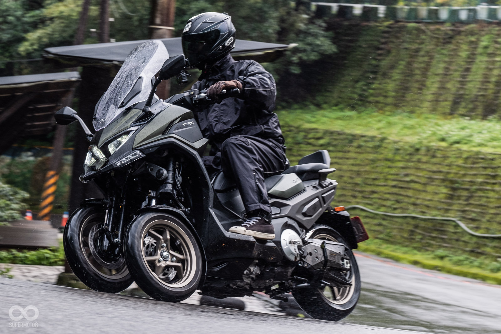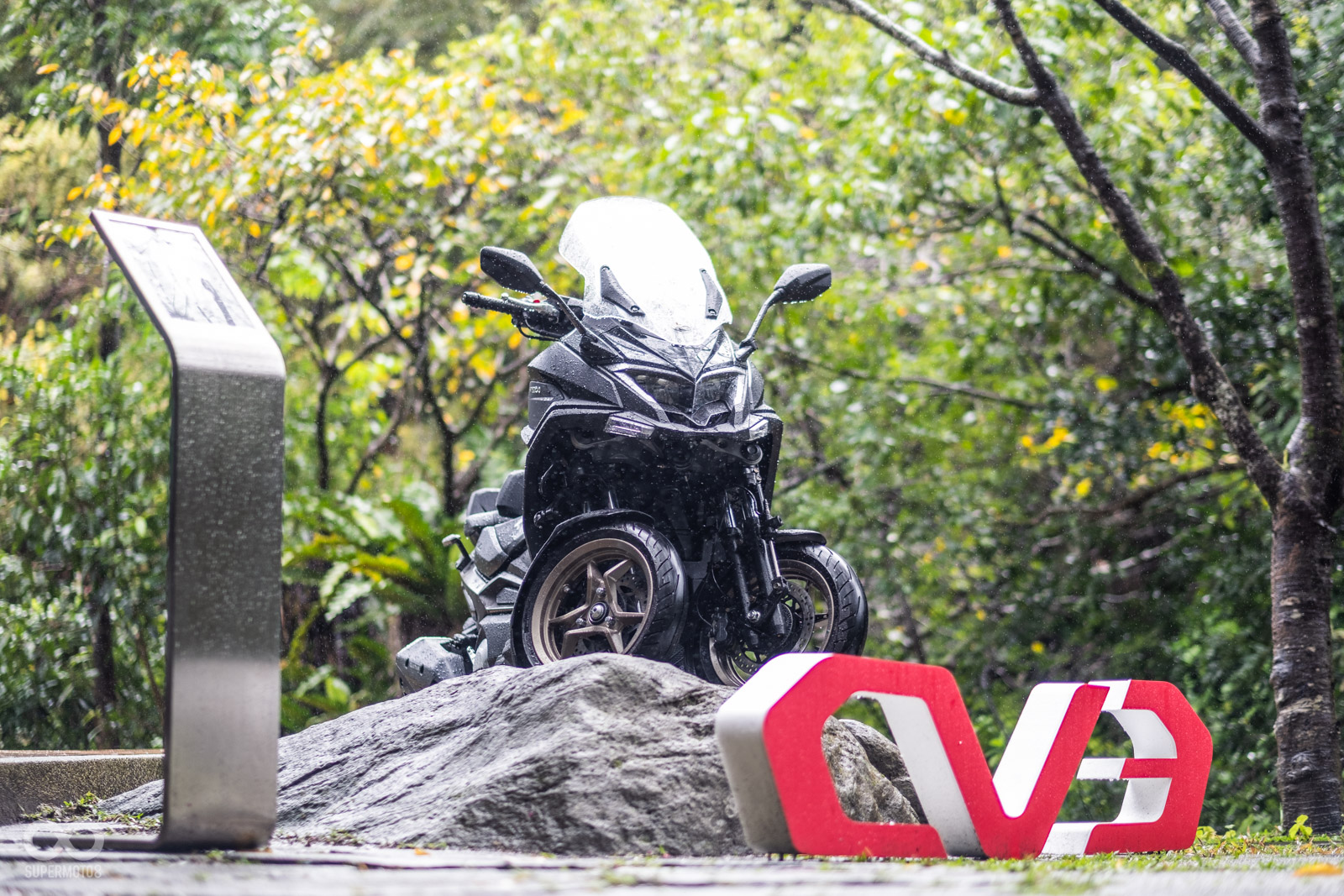 騎乘過程中壓過人孔蓋,稍微滑移的前輪立刻恢復循跡性,甚至我們同行拍攝的白牌速克達在溼滑彎道中更是明顯被CV3海放,確實在這個極端天候下,可以完全體驗到三輪車額外帶來的安定性。
