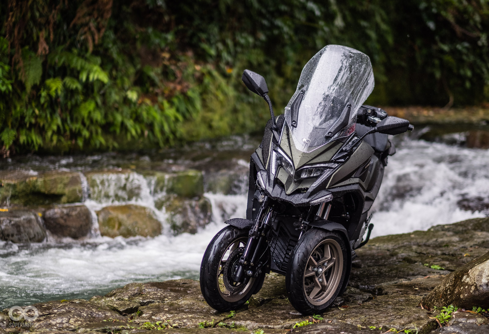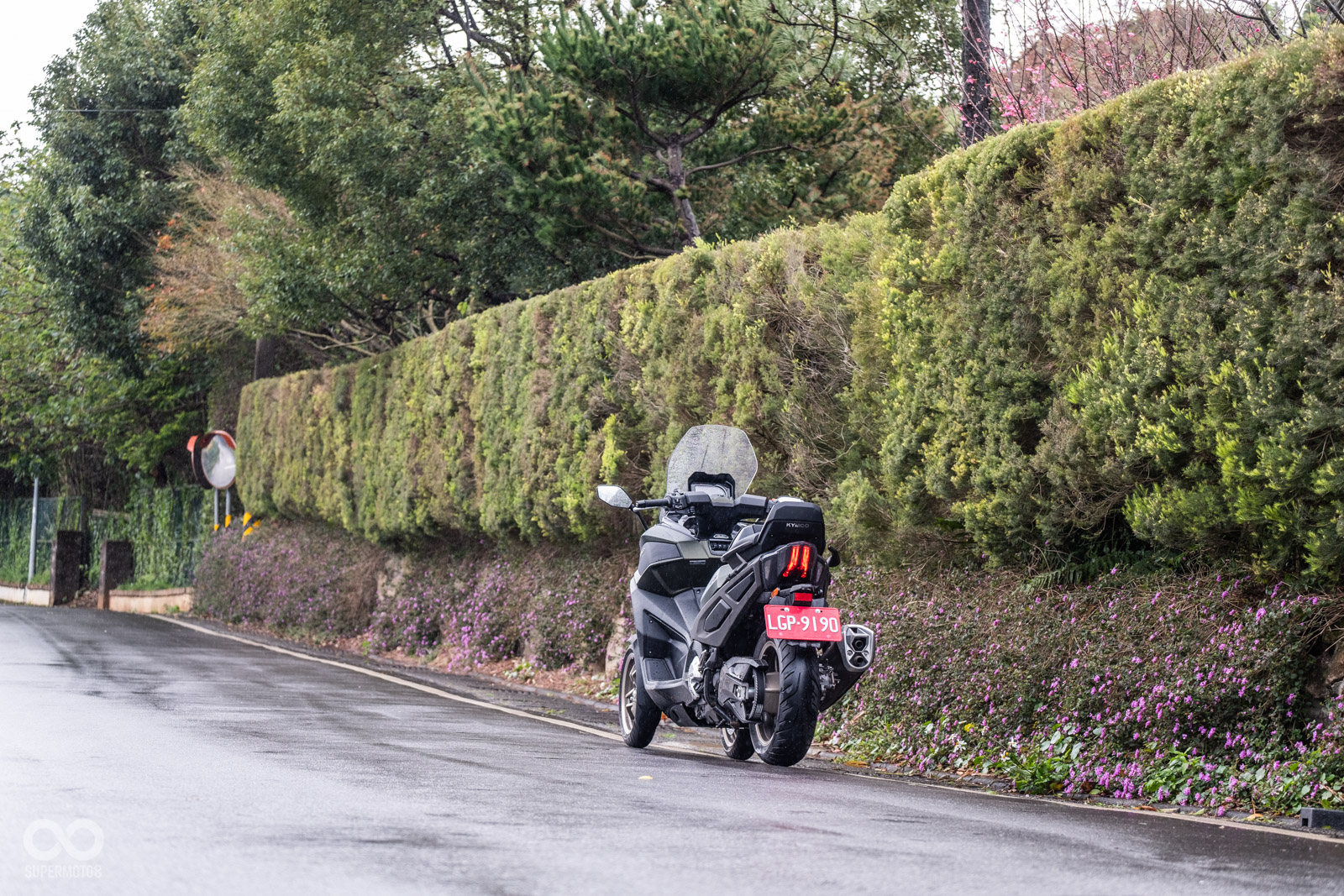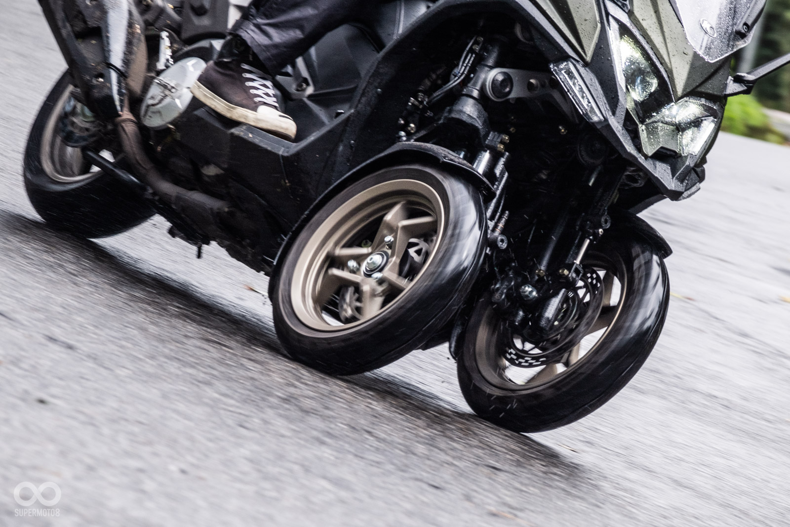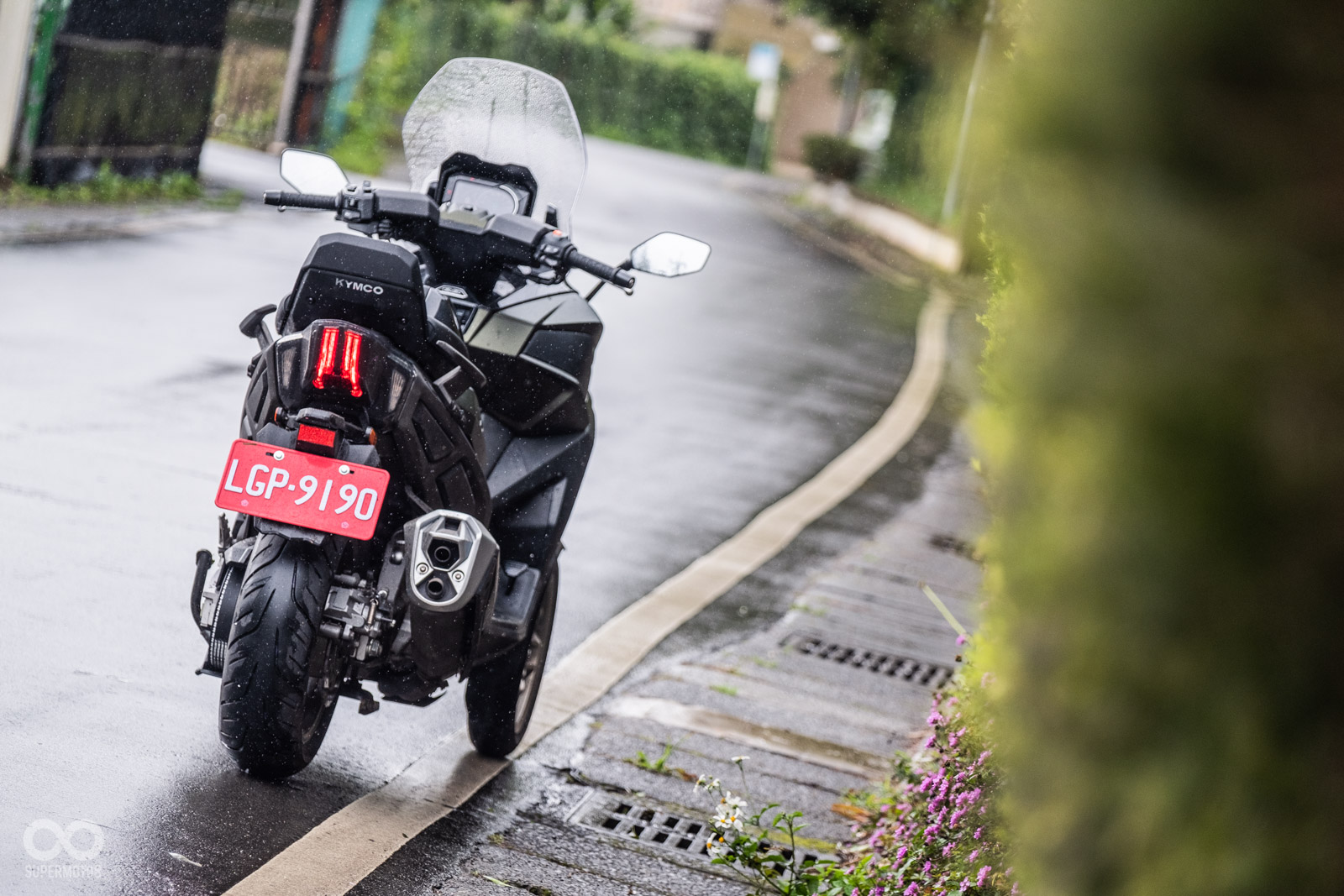 騎乘過程中壓過人孔蓋,稍微滑移的前輪立刻恢復循跡性,甚至我們同行拍攝的白牌速克達在溼滑彎道中更是明顯被CV3海放,確實在這個極端天候下,可以完全體驗到三輪車額外帶來的安定性。