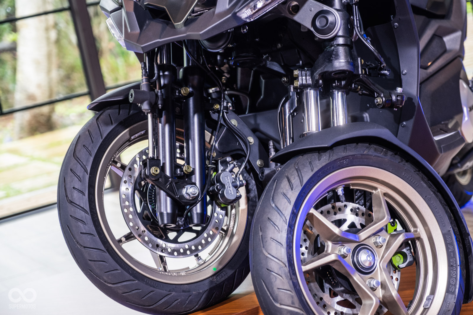 關鍵的前三輪規格,前輪使用雙110/70-13規格輪胎,搭配兩組雙活塞卡鉗;後輪160/60-R15,傳動機構延續AK、KRV上看到的PTM皮帶系統,CV3特別使用窄型皮帶減重。全車採用鋁合金車架,降低39%車體重量同時提升剛性,後半部的車架外露設計看起來相當粗獷,帶有點ADV車款風味,座高也壓在795mm。