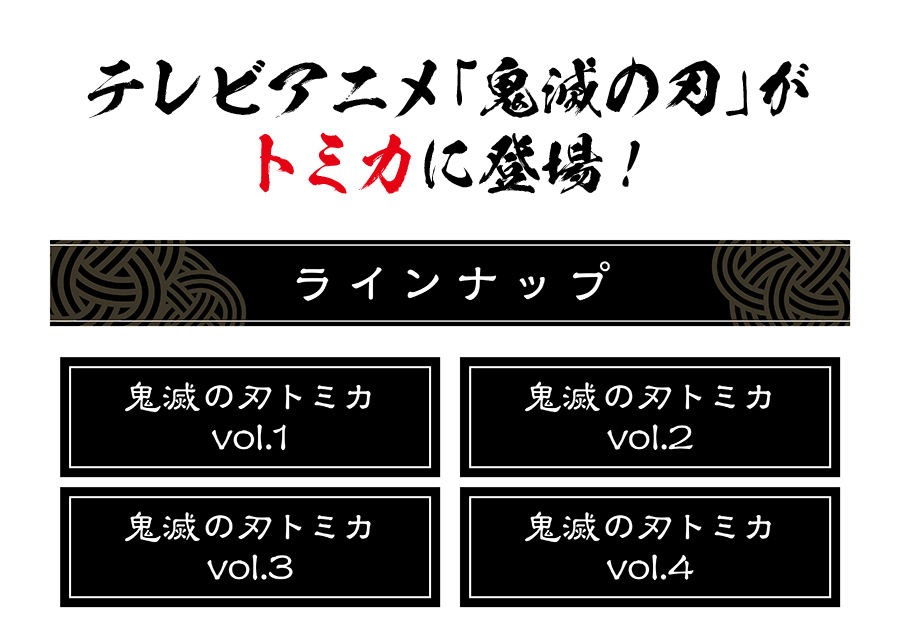 隨著風潮持續席捲,同樣來自日本的TOMICA小汽車也看準這項商機,立刻與「鬼滅之刃」合作,推出一系列聯名商品,並於2021年開始分四階段上市發售,讓喜愛鬼滅之刃與TOMICA的朋友一併收藏。