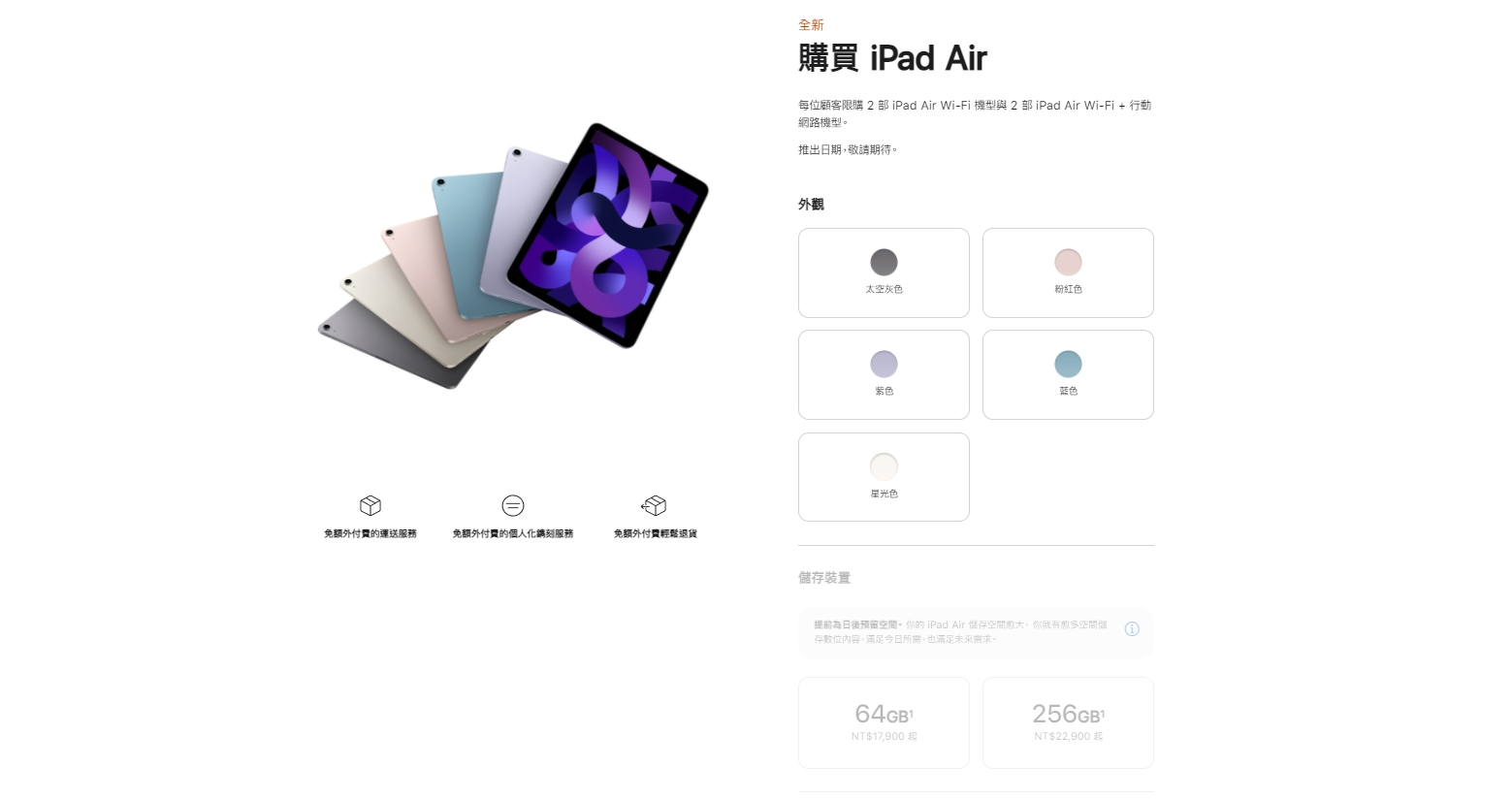 APPLE iPad Air 5本次推出深空灰、星光色、粉色、紫色,以及藍色五種顏色選擇,並分別有64GB和256GB兩種容量版本,台灣售價為64GB 17,900元起,256GB 22,900元起,台灣目前尚未公布預購和發貨時間。