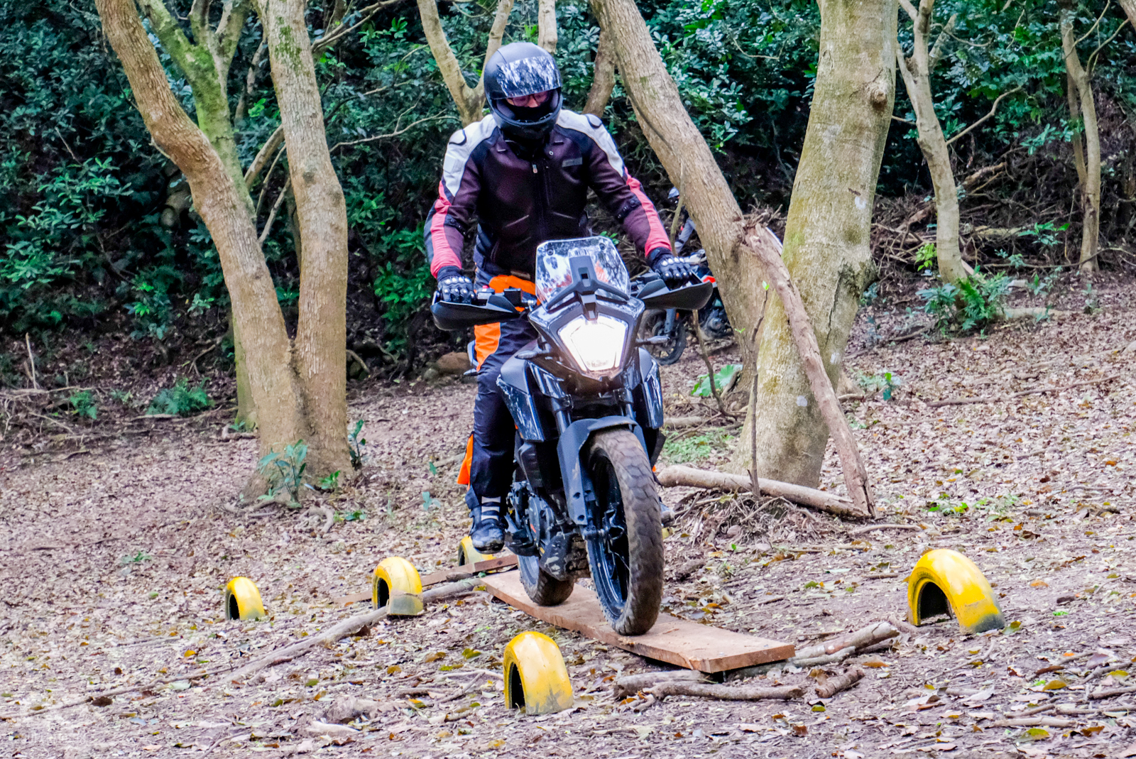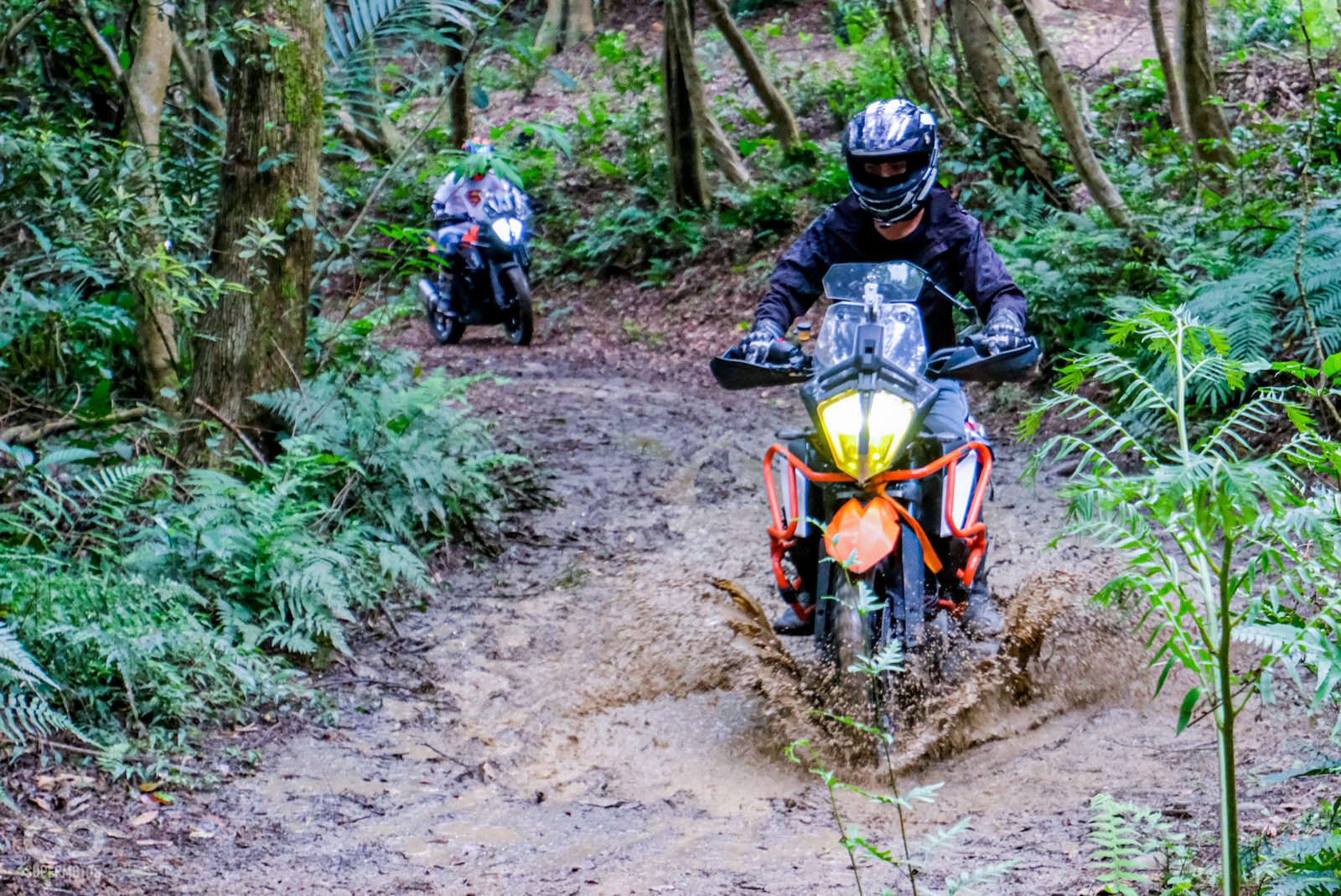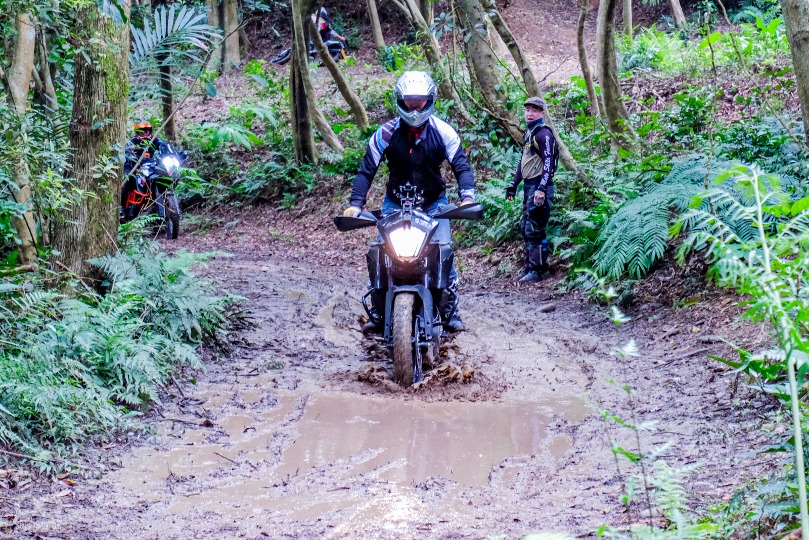 下一步則是進入正式的林道探索,這次MSF教練們安排的越野路線雖然看似簡單,但依舊有不少關卡的挑戰,加上課程當日早上有不小的雨勢,地面略微濕滑,部份路面甚至有積水的水坑,對於使用原廠胎的ADVENTURE車友來說是相當刺激的挑戰。