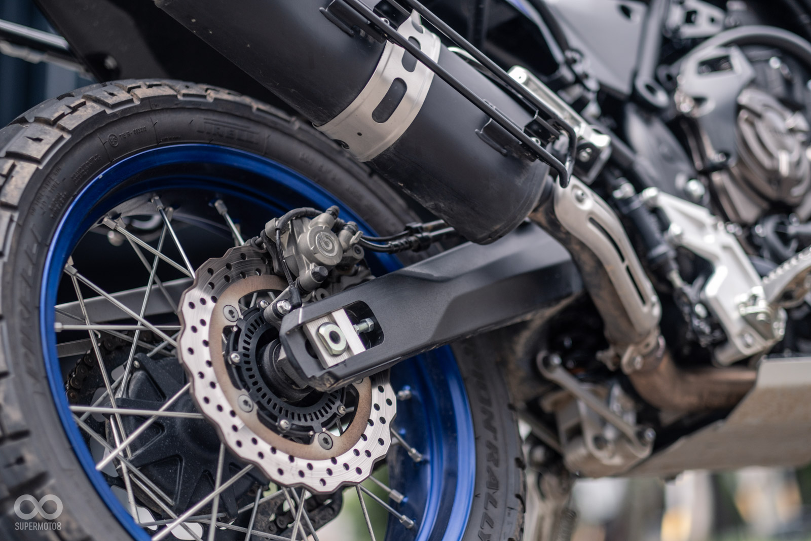 視線向後方看去,高大的油箱和扁平的坐墊線條,洋溢著純粹的越野魂,車身側殼也採用相當有越野車風格的線條向車尾收束,尾燈設計也採用和YAMAHA BW'S有些類似的橢圓形尾燈和扁平化車尾,整台車的視覺配上前21後18吋的輪圈,遠遠看去,Ténéré 700還真的比較像是一台越野車而非大型ADV。
