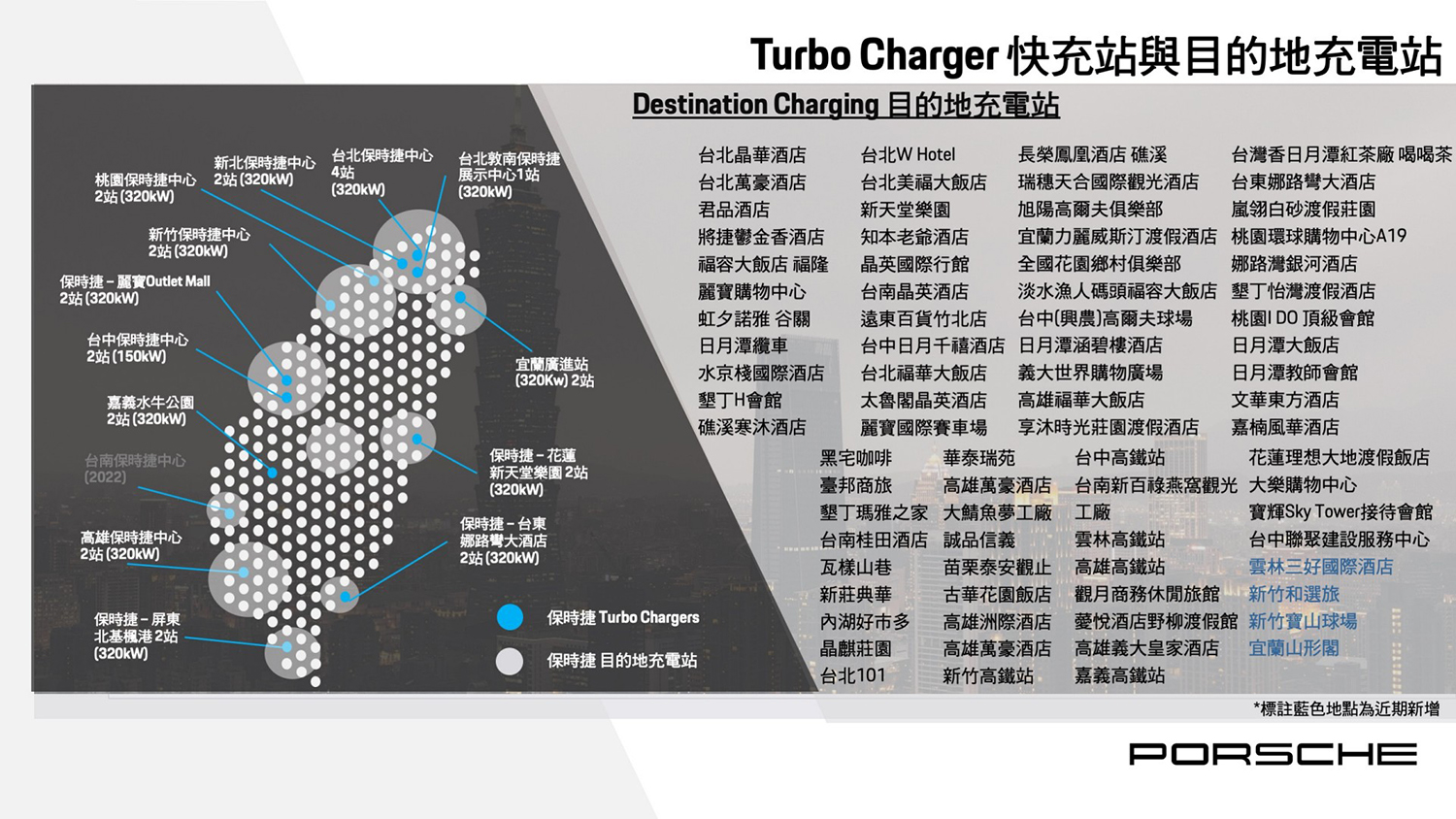 此外,台灣保時捷也宣布新增4處目的地充電站(Destination Charging),分別插旗雲林三好國際酒店、新竹市和選旅、新竹縣寶山球場、以及宜蘭山形閣。台灣保時捷力求為車主打造優質、舒適,又方便的駕駛體驗,截至目前為止,全台保時捷充電網絡共有13處保時捷高速充電站(Turbo Charging),共達27支充電樁,以及78處目的地充電站 (Destination Charging),合計共167支充電樁。