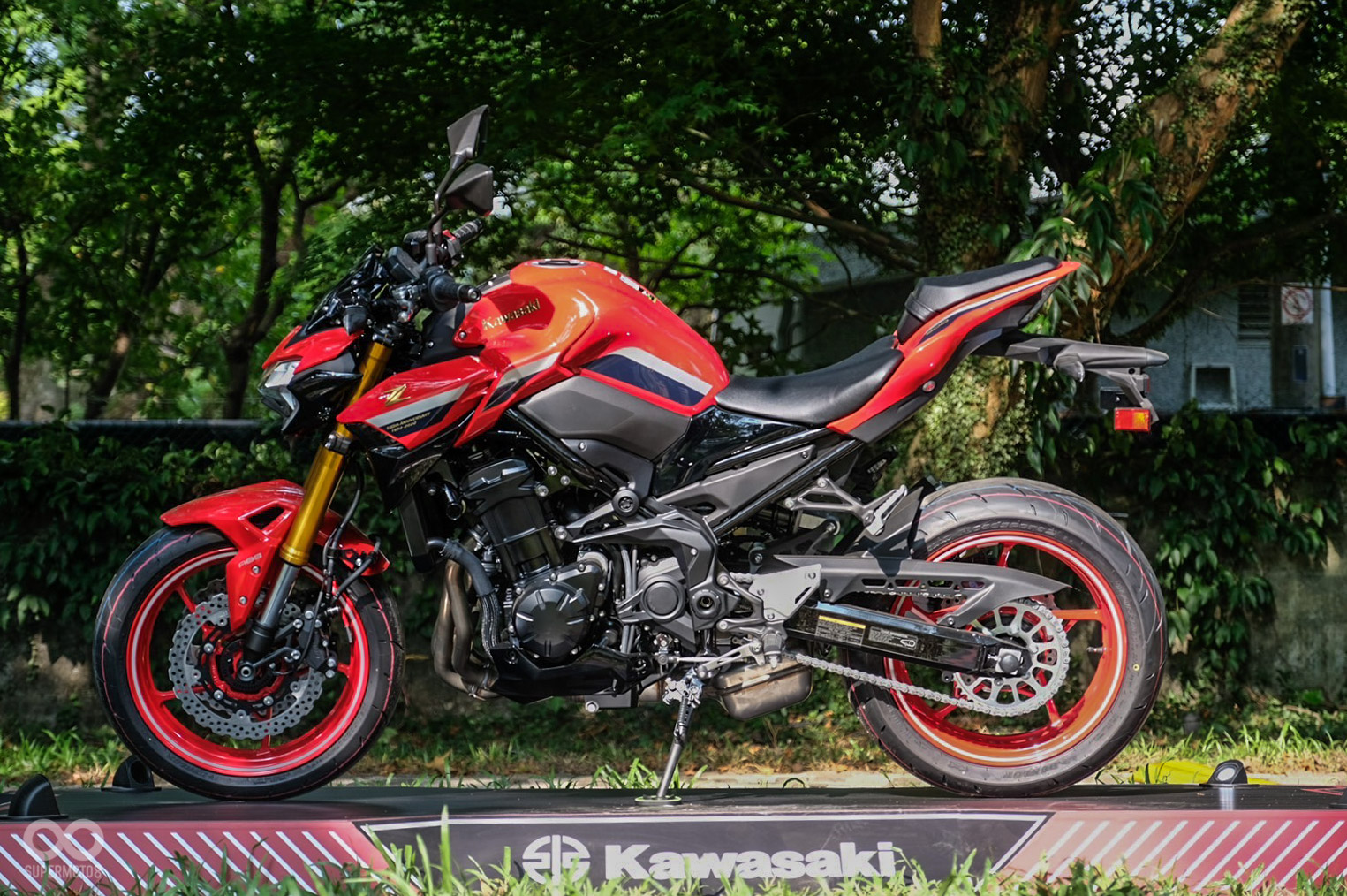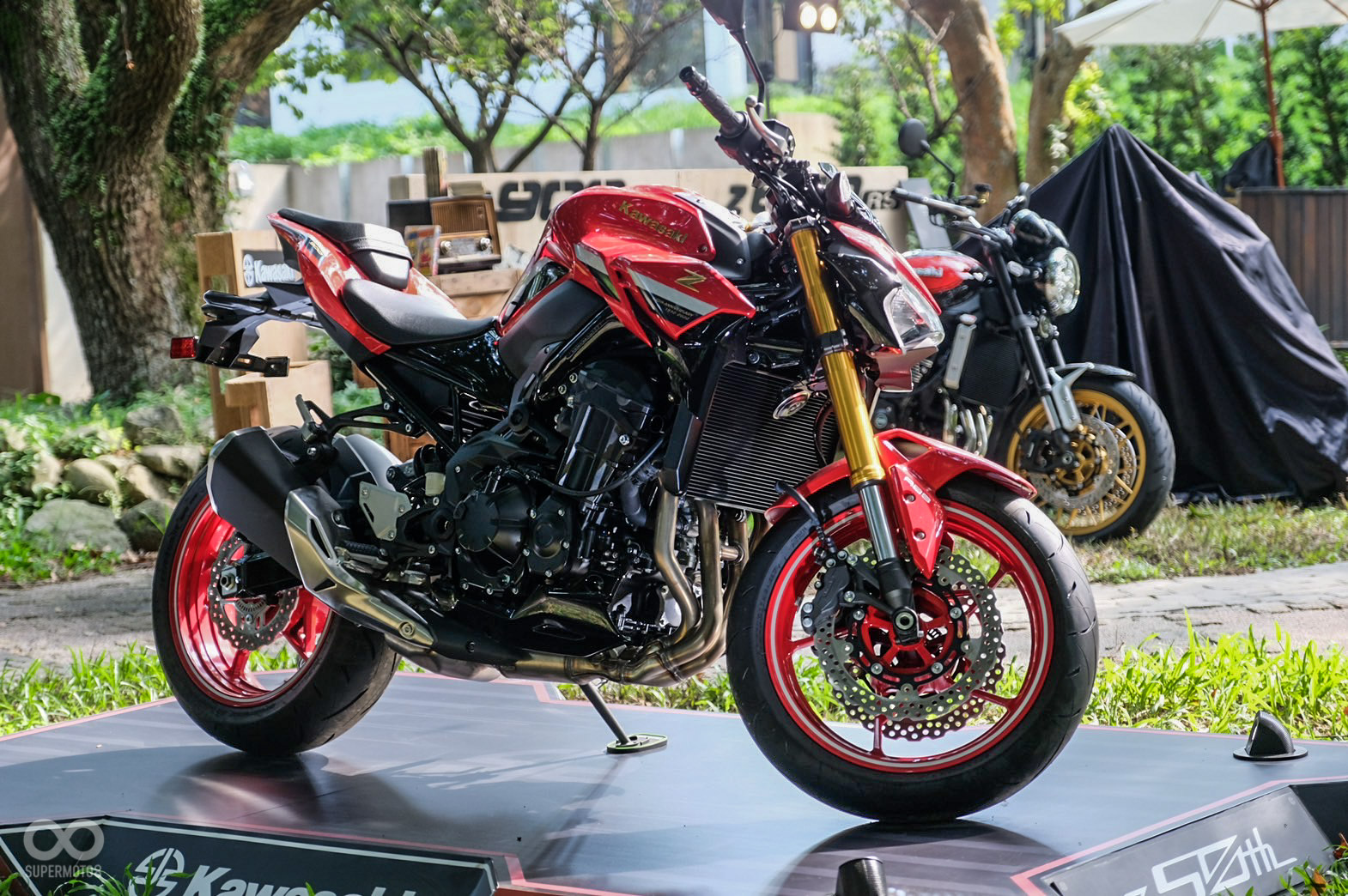 除了Z650RS新車重磅發表,本次發表會同場展出大量50th車款,當家的Z街車共引進Z650/Z900兩款車型50th版本,同樣換上呼應Z1100GP的炮竹紅配色,從車體一路延伸至輪框的紅色烤漆相當搶眼,另外這兩款車的KAWASAKI、Z等商標Logo,也全數改採金色塗裝呈現,前土除與側蓋上甚至還有金色的50週年字樣,如果你入手四缸街車Z900,前倒叉還升級為金色塗裝!