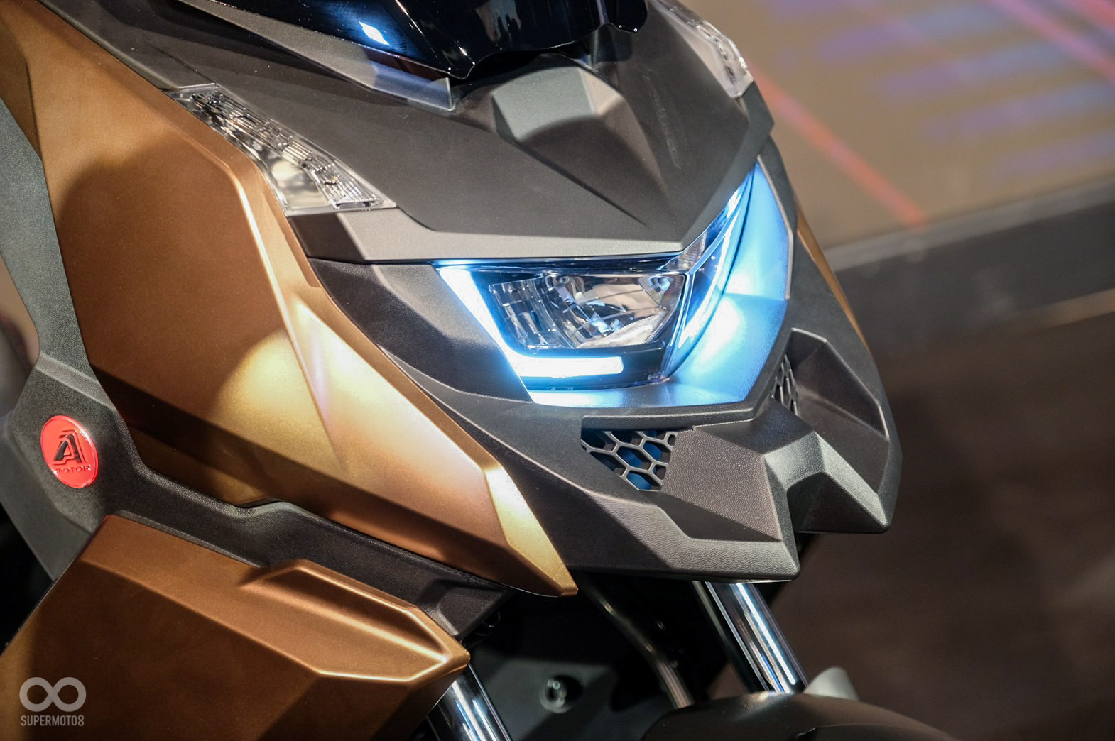 外觀設計上卻可以看出些許ADV風格造型,中置頭燈下方具有黑色塑料材質與小鳥嘴設計,搭配上方的風鏡看起來相當適合高架道路通勤,車尾則是相當短翹,強化車款的都會運動風格。