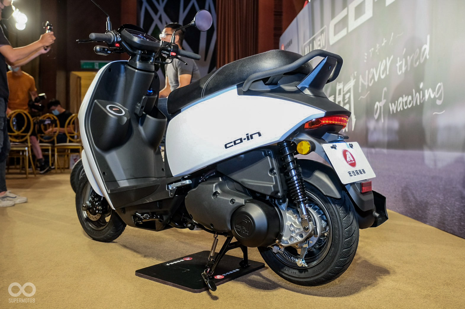 CO-IN搭載124.9 c.c.七期引擎,前後輪胎則為10吋配置;後避震為五段預載可調,都會小車最重要的實用性部分,760mm座高、省力中柱、KEYLESS提昇日常生活便利性。