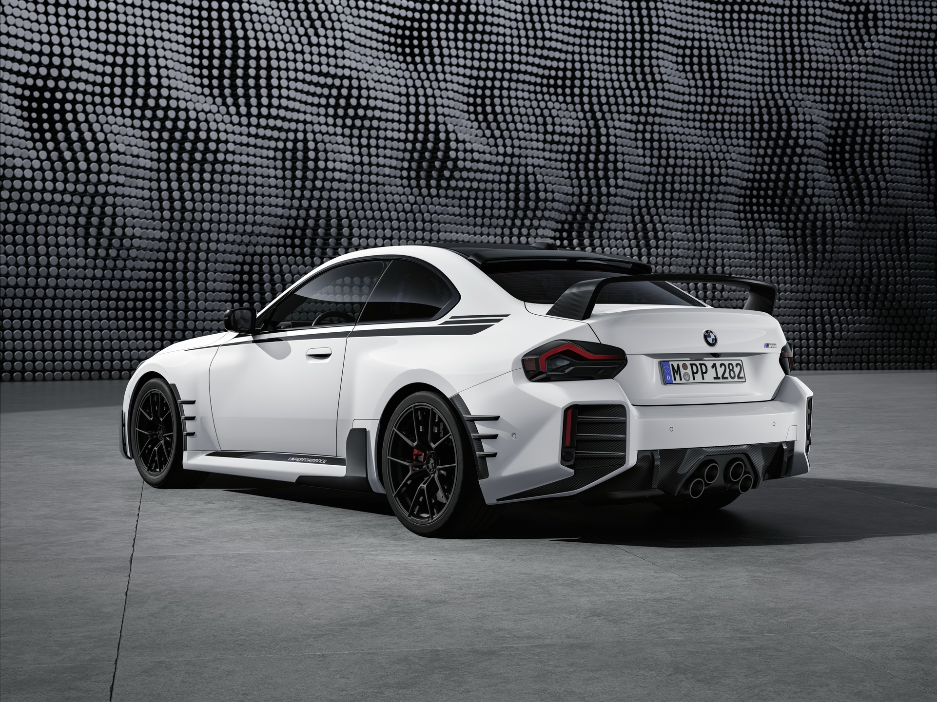 車尾提供兩種尾翼的選擇方案,第一種是「ㄇ」字型碳纖維固定式尾翼,另一種則類似鴨尾的碳纖維尾翼。此外,還提供高光澤黑色車頂邊緣擾流板以及碳纖維後擴散器。小地方點綴則有M款賽車拖車帶與M款鯊魚鰭天線等。