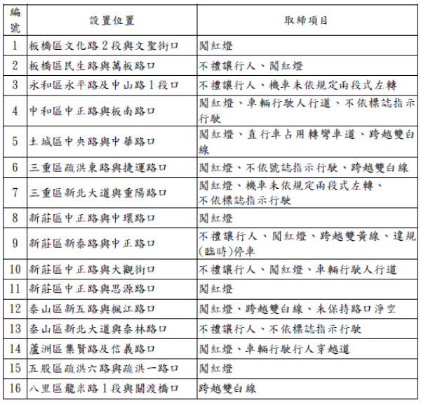 新北市警察局強調,科技執法係以防制違規肇事、改善行車秩序為目的,非以取締為主要目標,本次新增16處路口科技執法,在本市都會區重要路口設置,特別拉長宣導期,望駕駛人注意並改正違規行為,勿以為沒看到警察就不遵守交通規則。期許駕駛人多一些耐心,確實遵守用路規則,禮讓行人優先通行,尊重大小車輛及行人路權,共同維護新北交通安全。