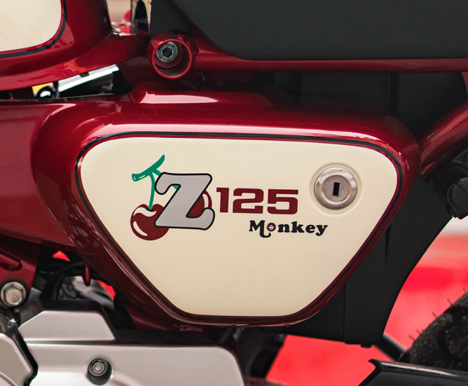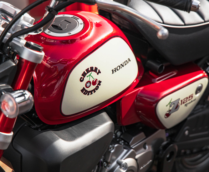 新登場的2022 Honda Monkey 125 Cherry Edition,在外觀上維持Monkey 125經典的紅白色搭配,但油箱、側蓋部分則加入新的奶油白點綴,奶油白底色的車殼上也印有可愛的櫻桃圖案和字樣;比較可惜的是,坐墊部分沒有採用2023年式最新的格紋坐墊設計。