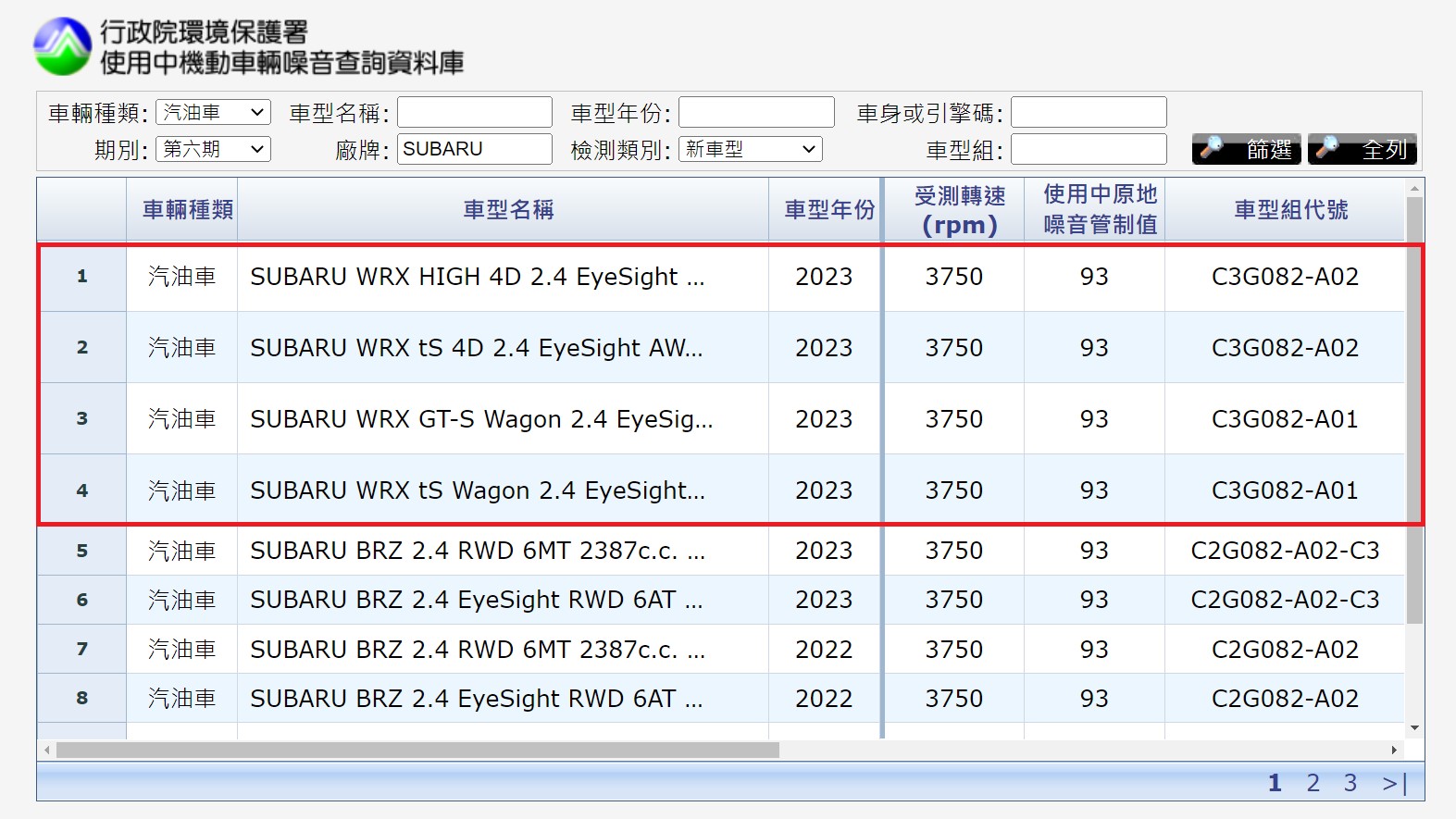 在環保署噪音測試檢測資料中,Subaru 總代理對 Levorg 和 WRX 分別送測了兩款車型,四門車款 WRX的部分為「WRX High 4D 2.4 EyeSight AWD」、「WRX tS 4D 2.4 EyeSight AWD」,而五門旅行車Levorg 則因順應全球化命名策略,換上 WRX Wagon 的車名,送測「WRX GT-S Wagon 2.4 EyeSight」、「WRX tS Wagon 2.4 EyeSight」兩款車型。
