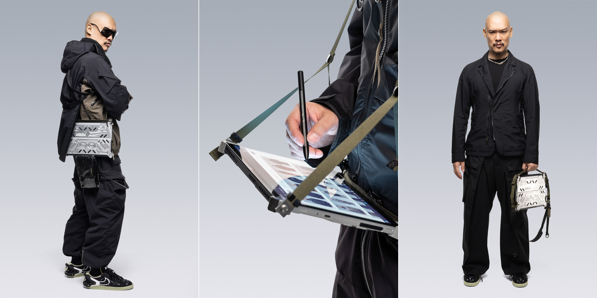 更厲害的是,ROG FLOW Z13-ACRNM RMT02還有一個獨創的揹帶系統,讓你可以在手提、肩揹以外,還可以把筆電放置於腹部高度的「攜行模式」,在移動中雙手仍可握持觸控筆或直接操作觸控螢幕進行使用,對於數位遊牧民族來說非常方便。