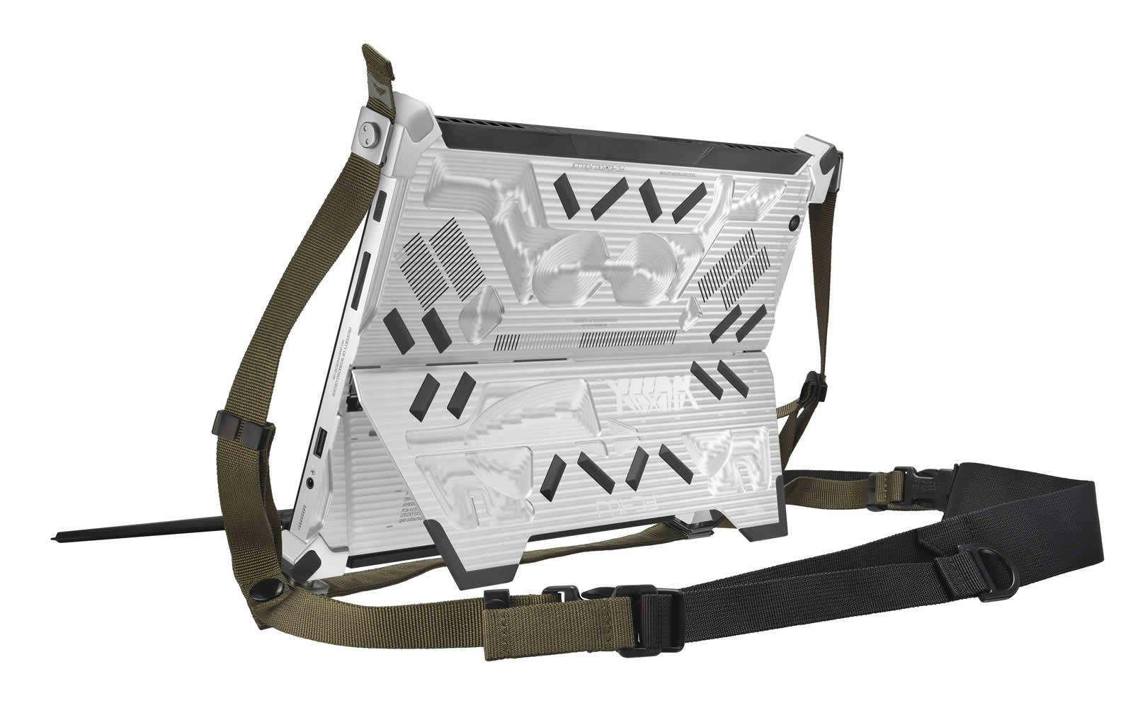 除了硬體規格之外,ROG FLOW Z13-ACRNM RMT02的外觀也十分吸睛。這款筆電由鋼鐵人服裝設計師Phil Saunders、平面藝術家Raf Rennie、背帶系統設計師Brandon Smith、創意總監Rod Chong等多方貢獻,以多功能、專業作業與免持裝置三者的交集為設計理念,機身以CNC銑削鋁合金材質設計,並嵌入四邊保護角、橡膠止滑元件提升握持穩定與防護力。