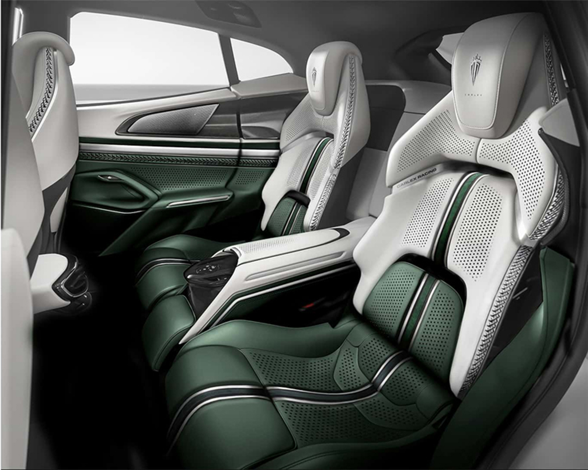 進到車內依舊使用綠色為主色調,不過外觀顏色的部分,到車內改為珍珠白,兩者讓車內散發出一種神祕感。綠色皮革、飾板部分包過車門板、儀表板、座椅等,而座椅背面河中央扶手則是珍珠白色為主。其餘像是頭枕處看得到Carlex Design品牌標誌。