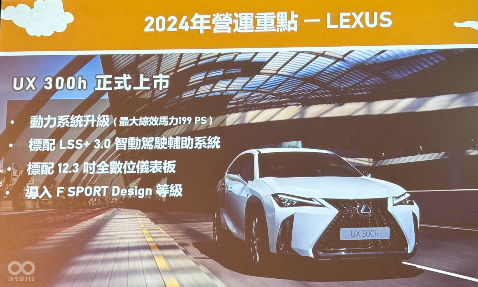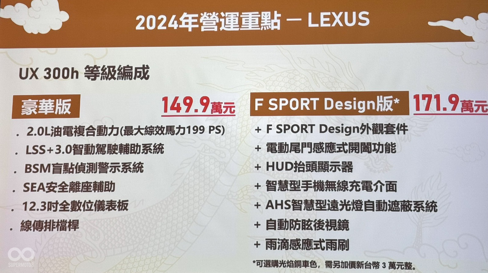 特別引人注目的是小改款後的Lexus UX 300h售價與規配公布。這次小改款UX 300h升級了2.0L引擎與最新的油電系統,最大馬力提升到到199 PS,並配備了LSS+ 3.0智慧駕駛輔助系統和標配12.3吋數位儀表板等先進設備,頂規車型導入F SPORT Design外觀套件。UX 300h的上市價格被設定在149.9萬/171.9萬台幣。