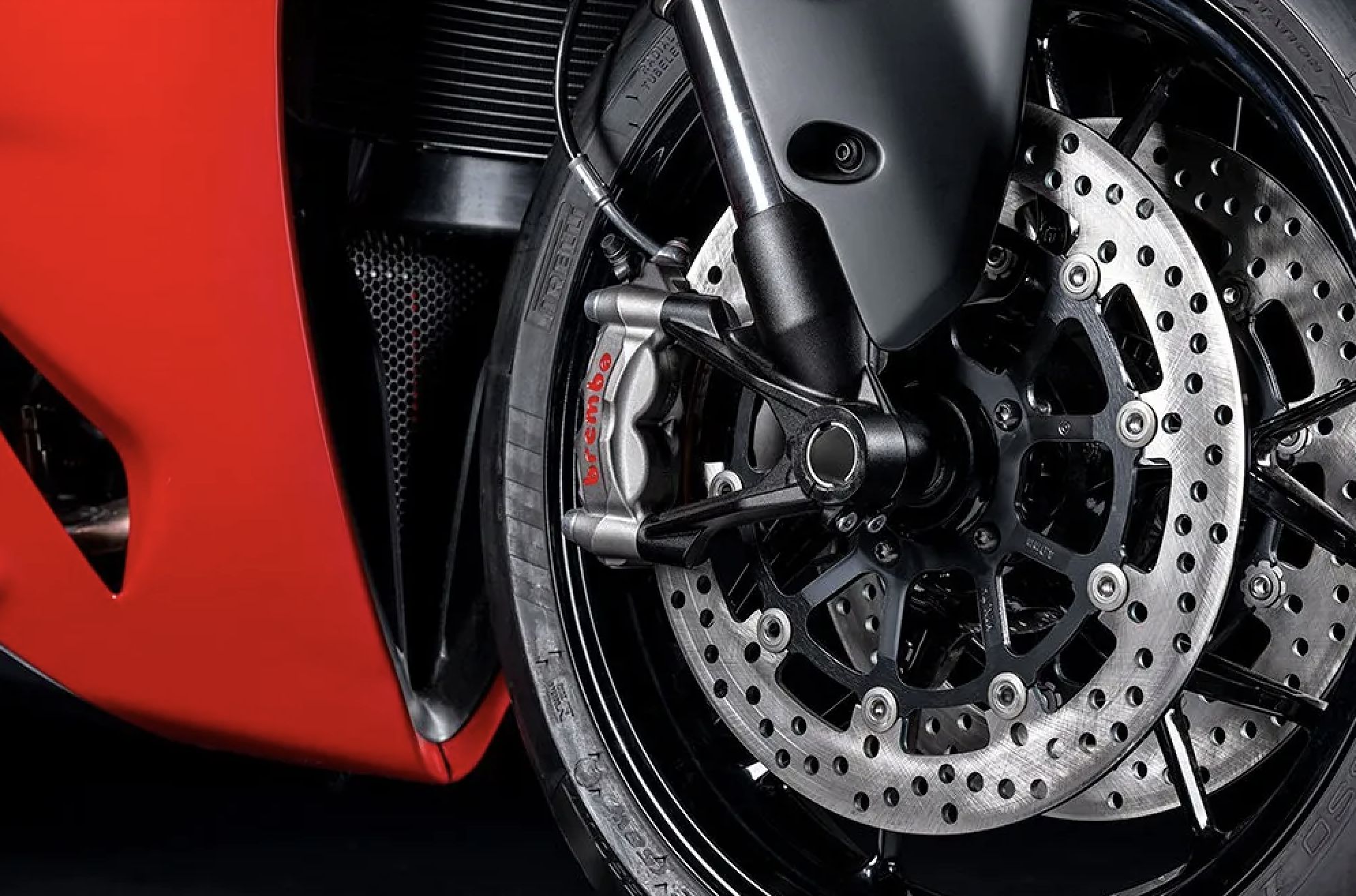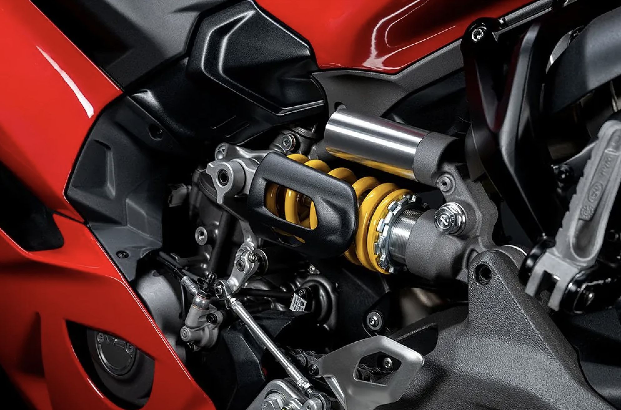 V2 的主車架採用單體式鑄造鋁合金,搭配副車架同樣使用鋁合金的結構,讓它不僅輕而且硬。而懸吊部分,V2 標配的是前 43mm 可調 Marzocchi 倒叉以及後 KYB 多連桿避震,而高規的 V2 S 則更進一步,選用 Ohlins 懸吊與前 43mm Ohlins NIX30 阻尼套件,讓你在彎道裡更有自信、屁股也更舒適。