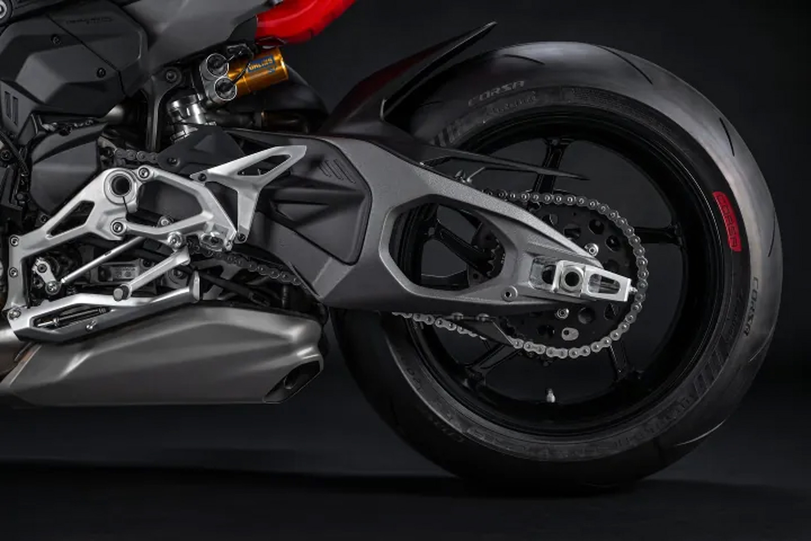 車架方面,Streetfighter V4 也獲得了來自 Panigale 的新式鋁合金車架,前車架更輕且橫向剛性降低,減少了以往版本的重量。Ducati 還把搖臂改成了全新雙側對稱中空搖臂,雖然有不少人會懷念以前的單搖臂設計,但 Ducati 說這次新設計的抓地力更好、重量更輕,騎起來更俐落,犧牲一點「帥度」換來操控性,這應該是值得的。