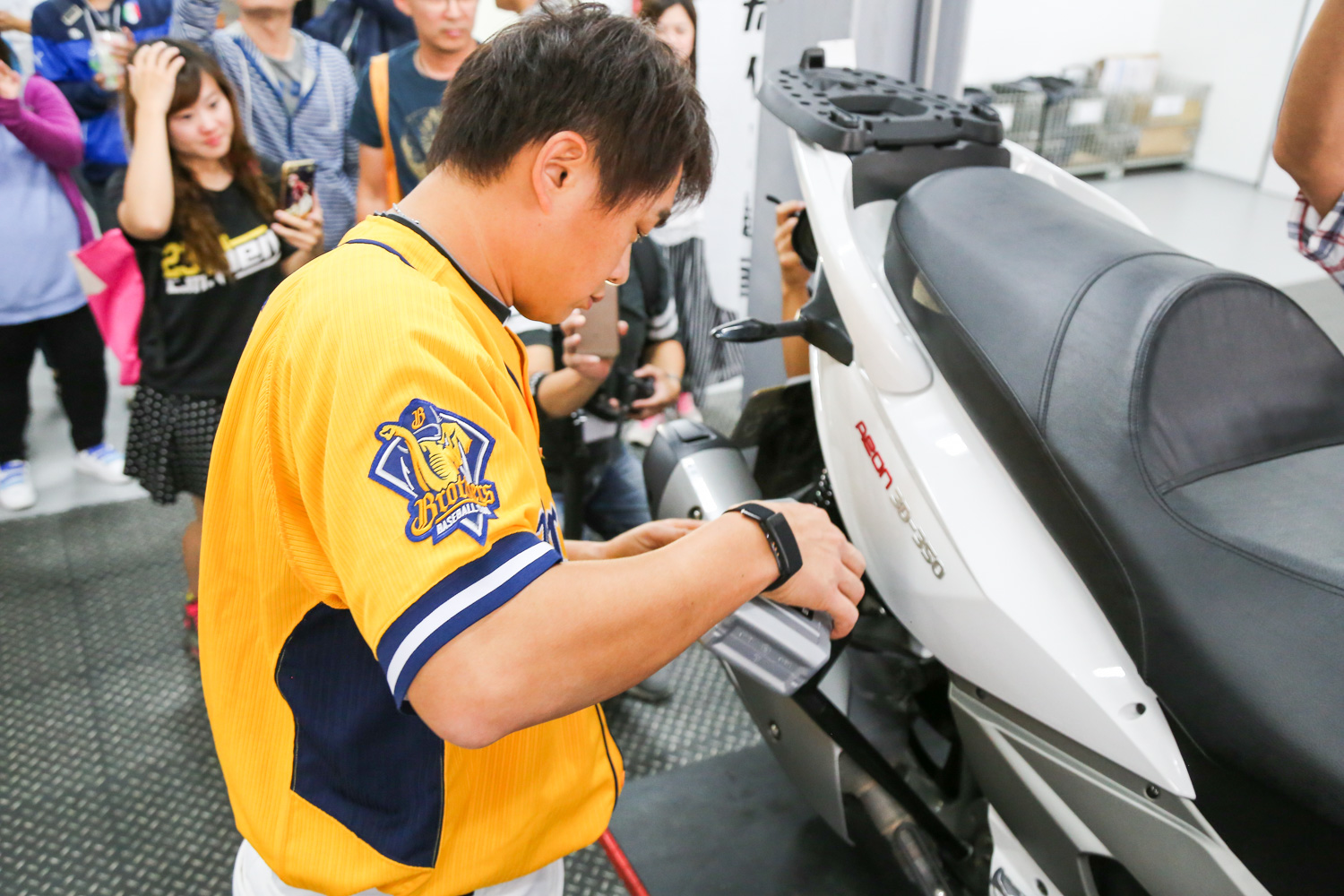 緃橫球場近30年的兄弟象隊精神領袖「恰恰」彭政閔,今(5/1)日受宏佳騰邀請至新開幕的台南南霖旗艦展示中心擔任一日店長。活動當天恰恰和宏佳騰鍾杰霖董事長一起為旗艦展示中心剪綵外,還親自至保養區幫3D-350替換機油,現場除了宏佳騰車友外,還有一群死忠象迷,讓旗艦展示中心開幕非常熱鬧。