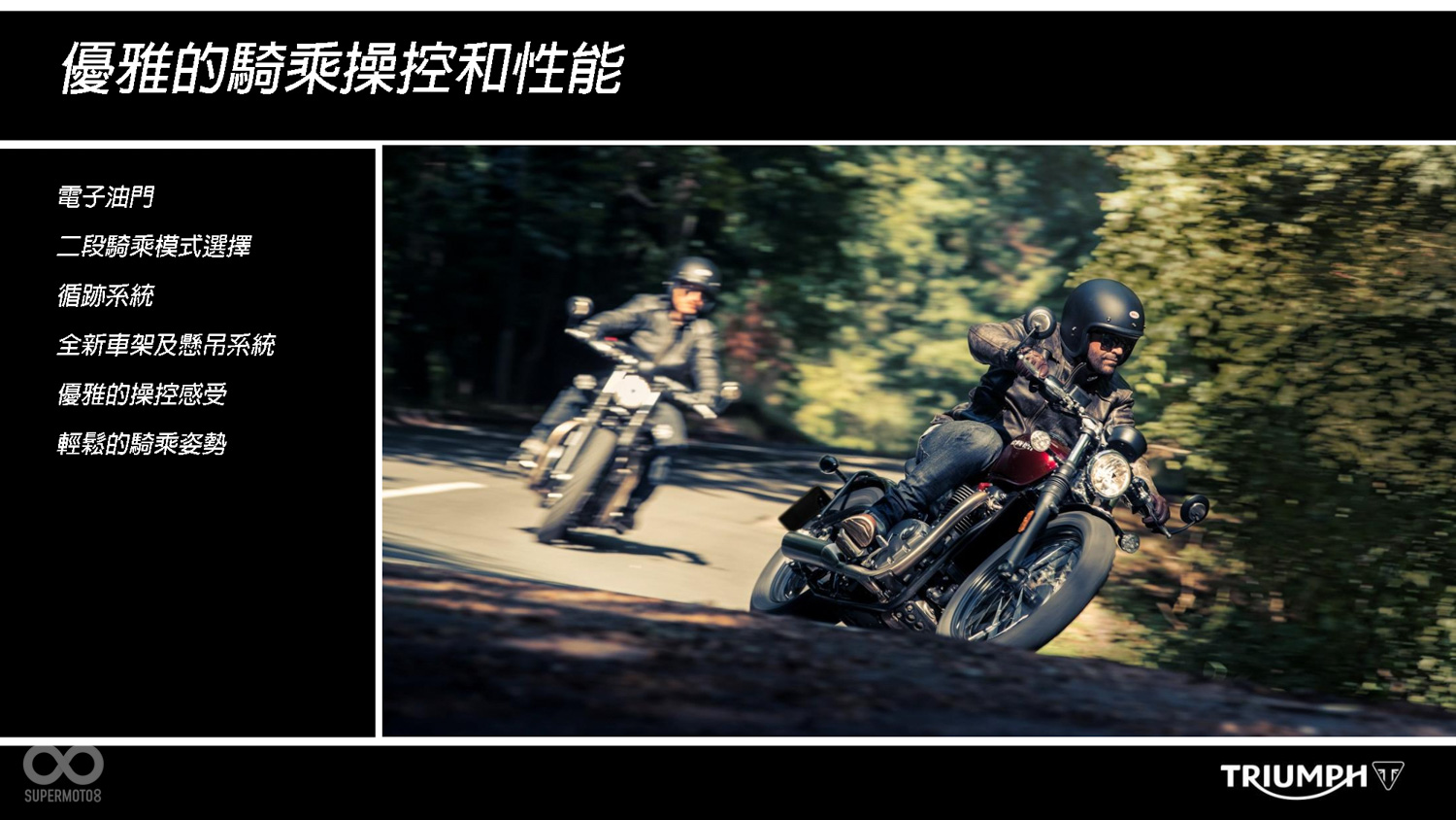 除了標準的美式風格,Bobber的內在同樣不容小覷,使用與T120相同1,200c.c.並列式雙缸水冷引擎,最大扭力10.8kg-m在4,000轉便能產生,此外還搭載了電子油門、雙騎乘模式切換、TC循跡防滑、ABS防鎖死煞車,甚至還能選配在嬉皮車上相當少見的電子定速系統,讓Bobber除了美式的粗獷,更多了高科技的電子輔助,給予騎士更全面的行車防護。