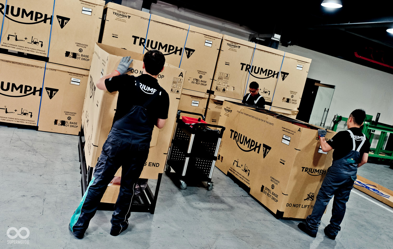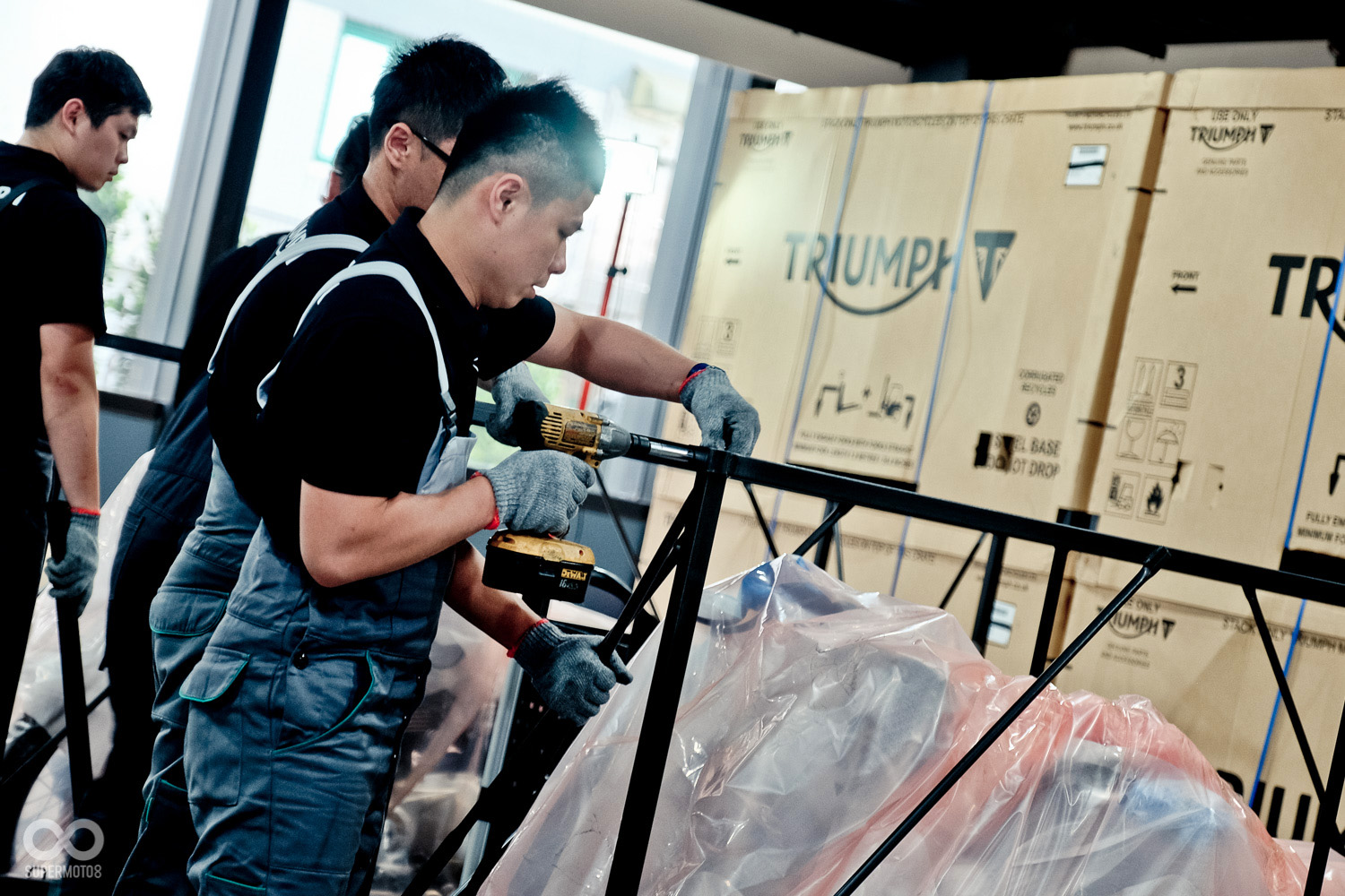 聽完Bobber的介紹後,即進入本日的重頭戲開箱儀式,本次安東特別準備了兩輛剛到港的Triumph Bonneville Bobber,一邊拆箱的同時也細心地向我們說明拆箱的步驟,以及應該注意的事項,而在拆箱工作完成後,技師還需再進行詳細的檢查以及最終的校對,確保每輛交到顧客手上的新車都能完美無暇。