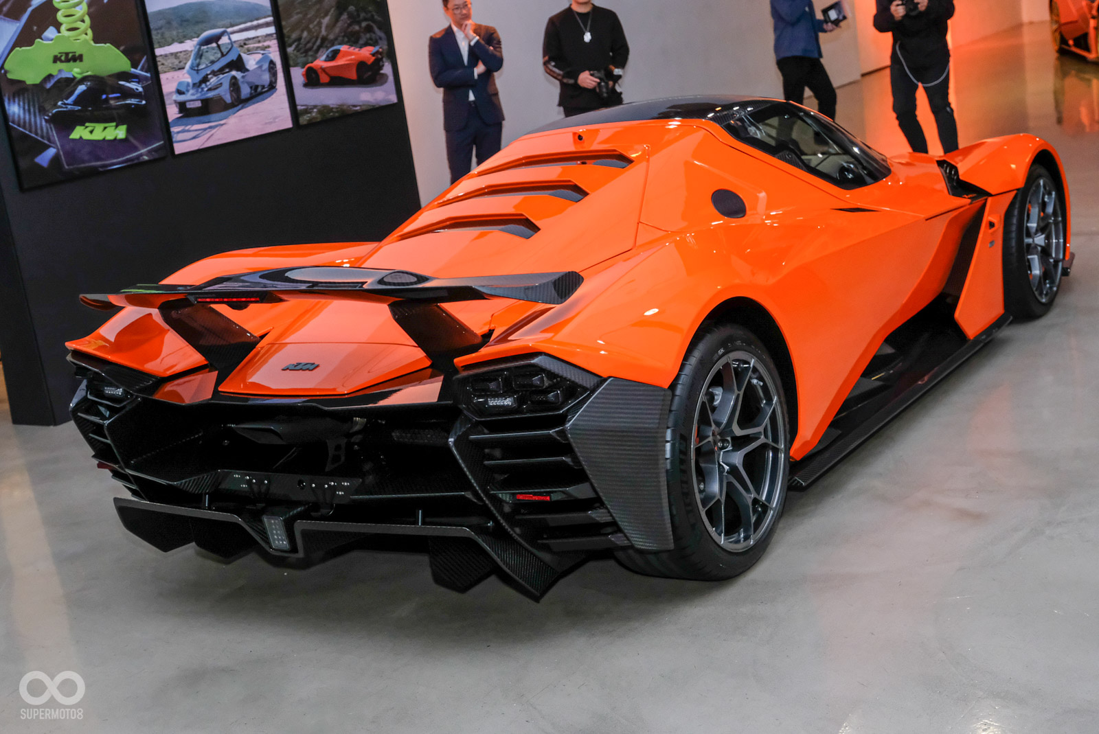 此次 X-BOW GT-XR 實車正式亮相,首輛導入台灣的 X-BOW GT-XR 以 Beluga Black 自選色亮面碳纖維包覆車身,搭配 Gold Gloss GT2 造型單孔輪圈、紅色煞車卡鉗及前軸懸吊圈簧打造極具侵略性的視覺風格,而車側 100 Limited Edition 紅色字標僅出現在首一百輛生產下線的 X-BOW GT-XR,更顯其限量獨特性。廠車風格的極簡內裝中選用與限定字標和卡鉗同色的紅色對比色縫線,車頂及座墊同樣以紅色六角形格紋縫線呼應外觀亮點,透過客製選色部件及賽車風格元素的巧妙搭配,傳遞性能張力氛圍。此外,首度現身的電磁橘 X-BOW GT-XR 則配置 Star Graphite Y 型設計標準輪圈及橘色卡鉗,車頭亮面碳纖維 KTM Logo、引擎蓋橘色字標及內裝橘色對比色縫線等細節點綴,宣示其運動化個性及速度美學,駕駛後方多達 160公升的行李廂空間選用織布包覆,現場特別展出 Meindl 專屬行李套件,結合 96 公升油箱、KW 車頭抬升懸吊套件,展現超級跑車少有的空間實用性與長程駕途體驗。