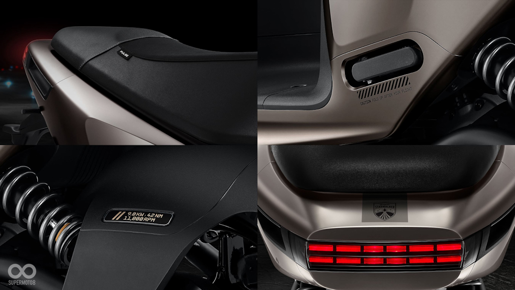 全新上市的 Gogoro Pulse Starwalker Edition,其名稱靈感來自星宇航空無線電通訊呼號「Starwalker」,象徵無限探索的精神;車身顏色源於星宇航空標誌性的大地金,金屬塗裝展現未來感與科技感的完美結合;車尾搭配 Starwalker 特仕徽章,代表騎士在星際之中暢意騎乘;車側與飛旋踏板處則融入航空設計元素,細節處刻印車款動力數據,向航空工程精密工藝致敬。此外,特仕防滑座墊也精心選用頂級皮革材質,提供更佳的支撐性與舒適度。特仕版體現卓越性能和質感美學,滿足對極致體驗有所追求的騎士。