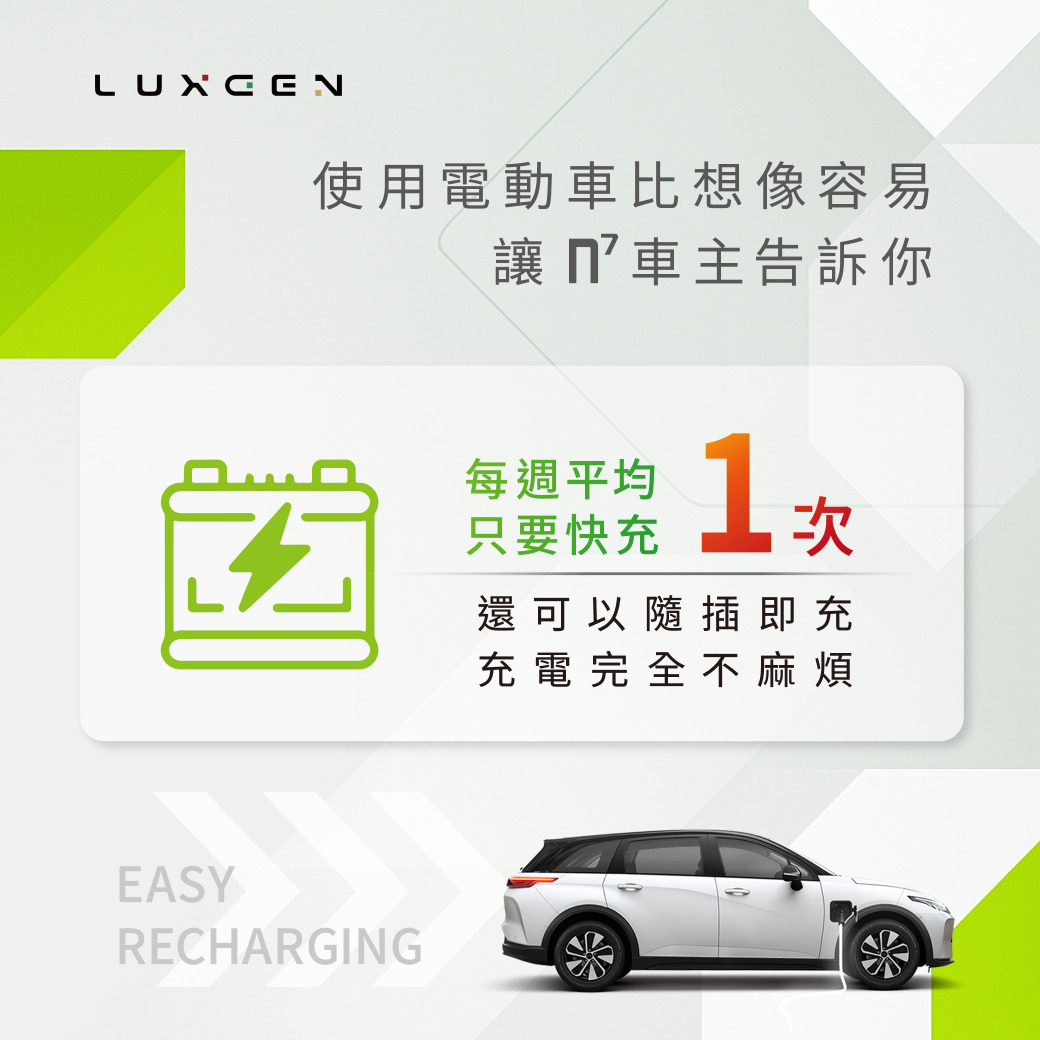 擔心電動車要花很多時間充電嗎?過去一年n⁷車主平均每週快充1次,並且搭配n⁷隨插即充功能,讓充電輕鬆不費力;擔心假日在外面充電人擠人嗎?事實是68%的充電行為發生在平日,無須擔心假日充電要排隊;n⁷標配隨插即充,整合台灣6大充電商,一個APP搞定充電、付款,無痛充電超便利。