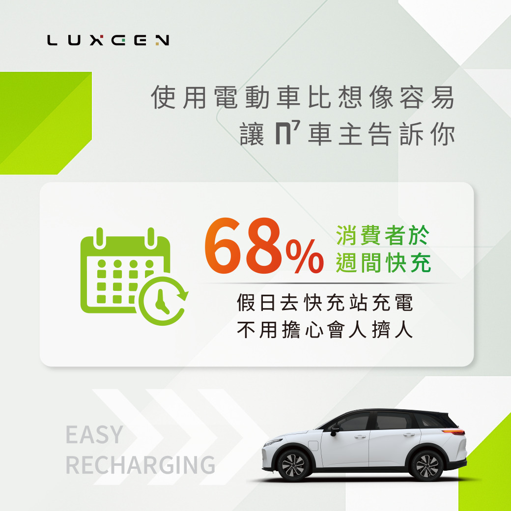 這次On⁷e of Taiwan的活動中,LUXGEN也首次發表了台灣史上最大規模的電動車真實使用數據,讓累積超過一年的 n⁷全體車主雲端大數據,告訴還在觀望中的車主,充電生活究竟是怎麼樣的節奏,拉近你與電之間的距離,內容包含:你擔心家中無法安裝家用充電樁就不適合電動車嗎?其實有超過60% 的n⁷車主沒有安裝家用充電樁。