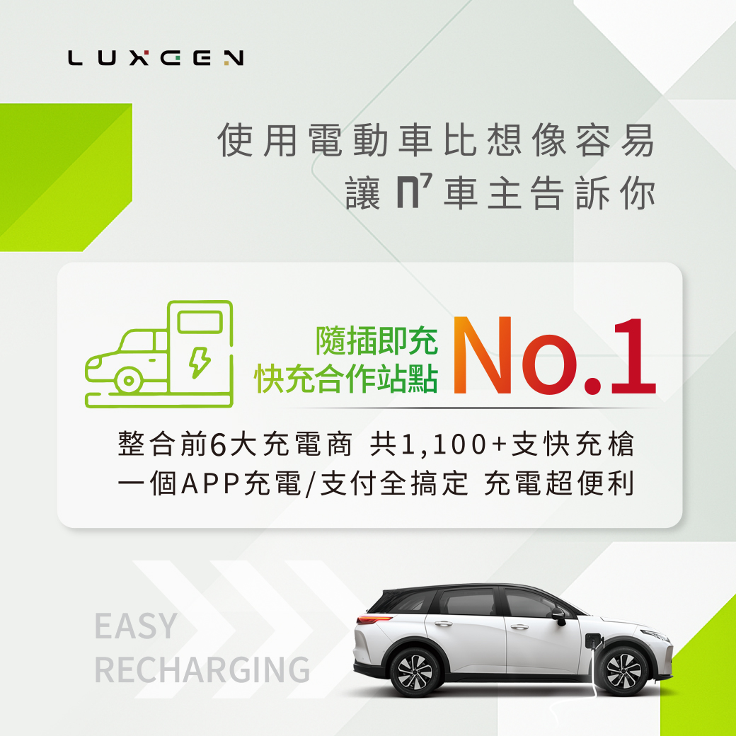 百萬內唯一新世代純電SUV—n⁷以「純粹亮點」為核心設計語彙,搭配2,920mm超長軸距解放車內空間的「無限可能」,LUXGEN透過建構LuxClub智慧移動生態系,整合包含EVOASIS、TAIL、U-POWER、iCHARGING、EVALUE及Yes!來電在內之主流充電服務商推出「隨插即充」的便捷服務、OTA雲端軟體更新讓你的車越開越新、車聯網手機遠端遙控,期待你的每一趟旅行,都能因為n⁷的陪伴寫下精采難忘的篇章,把握4/22-5/31活動期間,到LUXGEN活動專頁共同響應「On⁷e of Taiwan」,一同加入純電未來的行列吧!